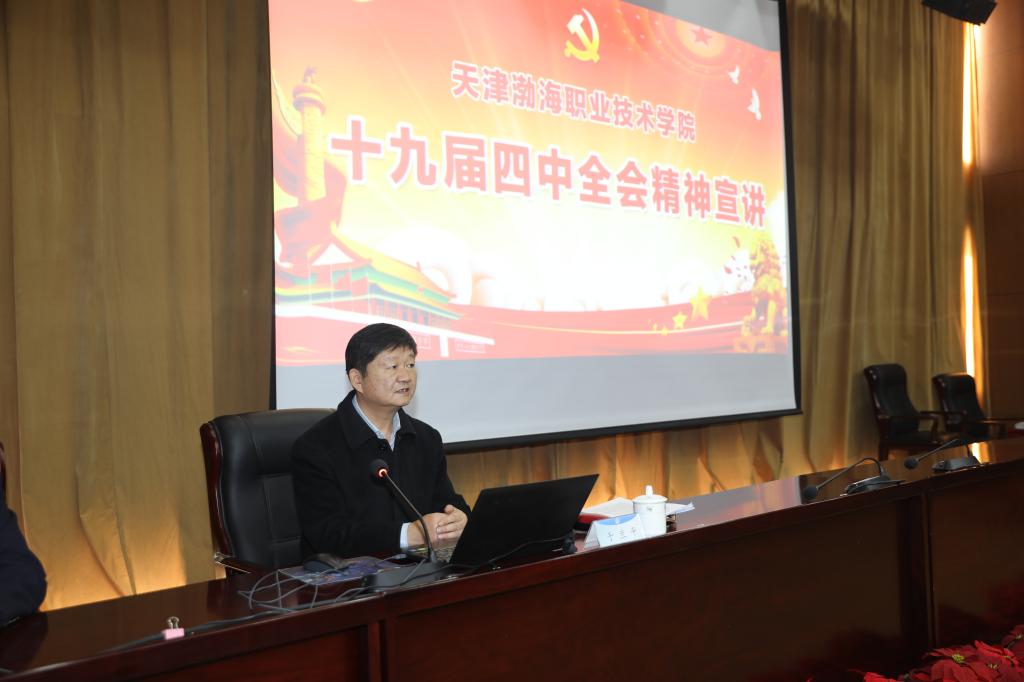 于蘭平著重介紹了黨的十九屆四中全會重要意義,用生動形象的比喻、樸實無華的語言以及通俗易懂的論證,深入淺出的就《中共中央關于堅持和完善中國特色社會主義制度、推進國家治理體系和治理能力現代化若干重大問題的決定》做了闡釋,就充分認識堅持和完善中國特色社會主義制度、推進國家治理體系和治理能力現代化的重大意義等五個方面的問題做了解讀,并就如何貫徹落實全會的部署要求,以及如何加強完善學院雙高校建設和文明校園建設提出了要求和希望。