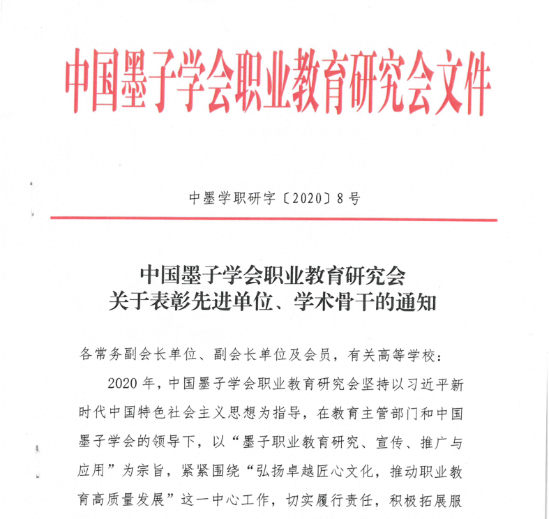 近日獲悉,學院榮獲中國墨子學會職業教育研究會2020年先進單位稱號。