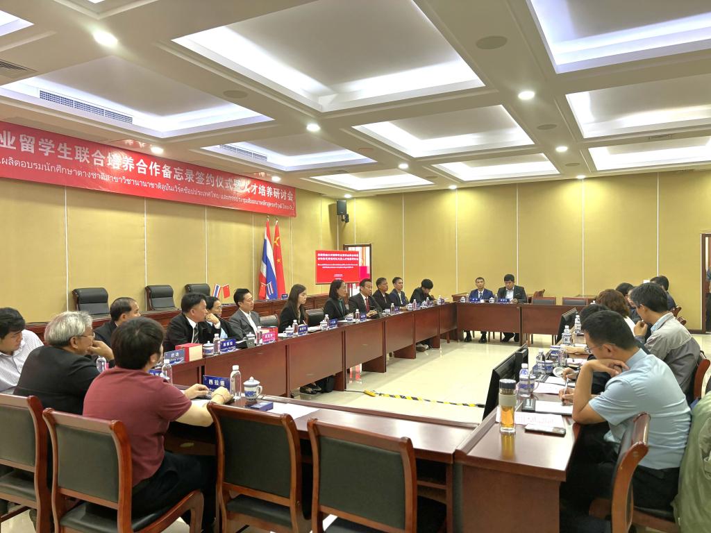 10月14日,學(xué)院召開泰國魯班工坊國際專業(yè)留學(xué)生聯(lián)合培養(yǎng)簽約儀式暨人才培養(yǎng)研討會(huì)。學(xué)院黨委書記魏炳舉,黨委副書記、院長花玉香,泰國大城技術(shù)學(xué)院院長瑪悠麗,泰國紅統(tǒng)技術(shù)學(xué)院院長拍暾等領(lǐng)導(dǎo)出席。