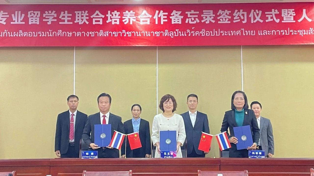 會(huì)上,花玉香、瑪悠麗、拍暾共同簽署泰國魯班工坊國際專業(yè)留學(xué)生聯(lián)合培養(yǎng)合作備忘錄。按照備忘錄,三方將充分整合各自優(yōu)勢(shì)資源,從合作招生、人才培養(yǎng)、師資培訓(xùn)等方面開展深入合作,共同推動(dòng)泰國魯班工坊蓬勃發(fā)展。
