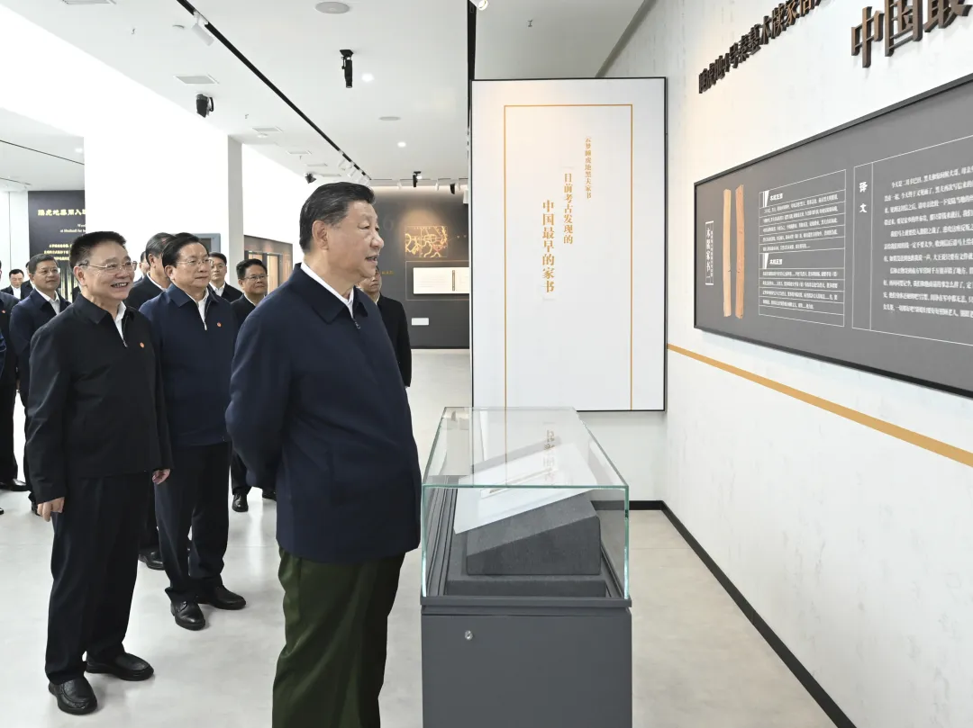 這是4日下午,習近平在孝感市云夢縣博物館參觀出土秦漢簡牘展。