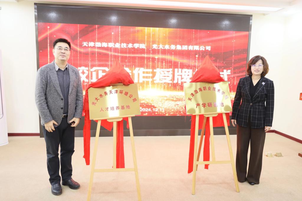 會上,花玉香就學院校企合作現狀、相關政策,以及學院發展建設情況進行了介紹,感謝了光大水務集團對學院人才培養工作的支持,并期待雙方的合作多出成果和亮點。光大水務天津環塘公司負責人對雙方立足新起點開展深度合作寄予高度期望,雙方圍繞深化校企合作、實踐基地建設、人才培養、優勢專業治理領域的實踐新模式等進行了深入交流。花玉香與劉永代總經理代表雙方共同為人才培養基地揭牌。同時,學院在光大水務天津環塘公司建立了產學研基地。隨后雙方就企業需求、合作的方向及學院專業群建設情況進行了交流。