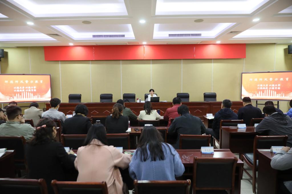 為深入學(xué)習(xí)貫徹習(xí)近平總書記關(guān)于教師隊(duì)伍和師德師風(fēng)建設(shè)重要論述,貫徹落實(shí)黨中央決策部署,3月24日,學(xué)院召開“師德師風(fēng)警示教育”專題培訓(xùn)會(huì)。學(xué)習(xí)傳達(dá)上級(jí)文件精神,通報(bào)相關(guān)典型案例,推動(dòng)壓實(shí)工作責(zé)任,進(jìn)一步加強(qiáng)和改進(jìn)師德師風(fēng)建設(shè)。會(huì)議由學(xué)院黨委副書記、工會(huì)主席、副院長(zhǎng)王蕾主持。各職能部門、二級(jí)學(xué)院黨政主要負(fù)責(zé)人40余人參加。