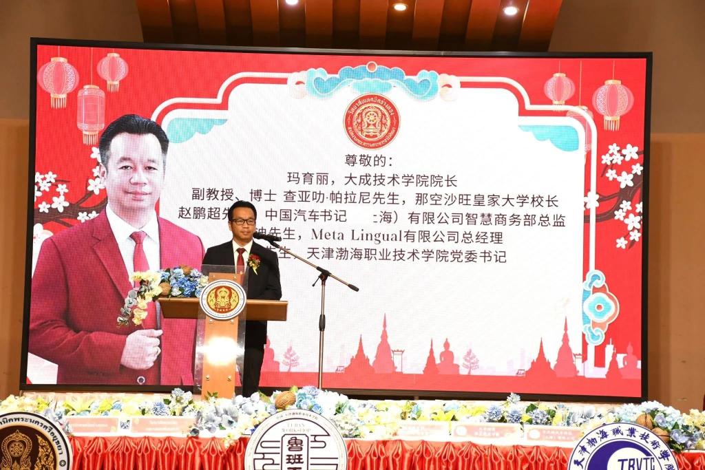 在成立儀式上,泰國職業(yè)教育委員會助理秘書長素拉鵬博士、泰國中部一區(qū)職業(yè)教育中心主任諾彭先生、泰國大城技術學院院長瑪悠麗、天津渤海職業(yè)技術學院黨委書記魏炳舉、泰國那空沙旺皇家大學農業(yè)技術與工業(yè)技術學院院長西巴維查功、中汽研汽車科技(上海)有限公司智能化業(yè)務部部長趙鵬超、泰國紅統(tǒng)技術學院院長拍通、金語智達科技(天津)有限公司總經理肖笛先后致辭,闡釋了共同體在推動中泰職業(yè)教育深度融合中的重要作用,共同描繪了以人才共育服務“一帶一路”倡議的壯麗愿景。