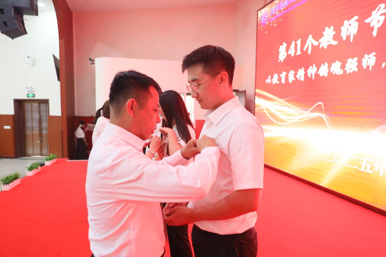 儀式現場還舉行了新入職教師校徽佩戴儀式,資深教師為新教師佩戴校徽,象征著教育使命的傳承與接力,激勵青年教師賡續育人初心、快速成長,早日成為職業教育事業的中堅力量。