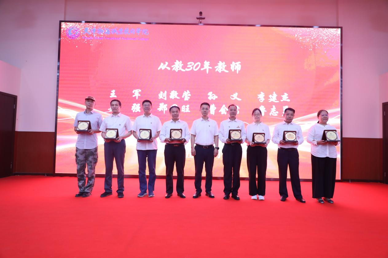 大會現場舉行表彰儀式,對從教三十年的教師代表予以表彰。學院領導為獲獎教師頒發紀念章,高度肯定他們三十年如一日扎根職教一線、潛心育人的執著堅守,贊揚他們用青春與汗水為社會培養大批高素質技術技能人才的突出貢獻。