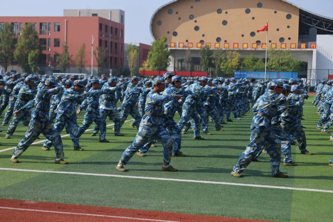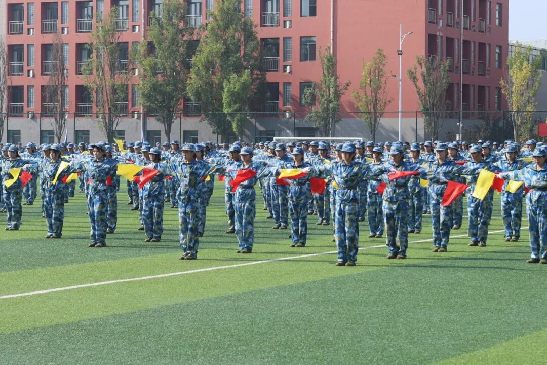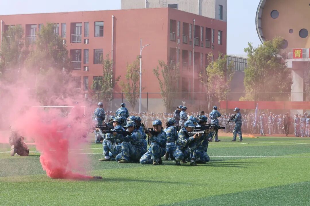 軍訓(xùn)匯演在魏炳舉的指令下啟動(dòng),國旗護(hù)衛(wèi)隊(duì)以堅(jiān)毅的姿態(tài)護(hù)送國旗入場,伴隨《義勇軍進(jìn)行曲》,全體師生向冉冉升起的五星紅旗行注目禮。隨后,在校旗方隊(duì)的引領(lǐng)下,由5個(gè)二級(jí)學(xué)院組成的16個(gè)分列式方陣依次通過主席臺(tái),嚴(yán)整的隊(duì)列、嘹亮的口號(hào)、剛健的步伐,展現(xiàn)出渤海學(xué)子如松的意志、如鐵的紀(jì)律。隊(duì)列方陣整齊劃一,軍體拳方陣剛猛有力,匕首操方陣精準(zhǔn)凌厲,旗語方陣變幻多彩,戰(zhàn)術(shù)方陣協(xié)同高效,21天的軍訓(xùn)成果在精彩展演中完美呈現(xiàn)。