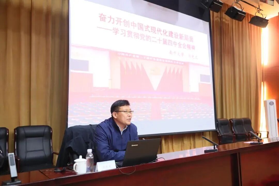 為深入學習貫徹黨的二十屆四中全會精神,深刻領會黨中央關于當前和今后一個時期國家發展的戰略部署,切實把思想和行動統一到中央決策部署上來,凝心聚力推動學院事業高質量發展,11月14日,學院召開黨委理論學習中心組學習擴大會議,特邀南開大學馬克思主義學院黨委副書記肖光文教授作專題輔導報告。學院全體領導、全體中層干部以及馬克思主義學院全體教師參加了會議。