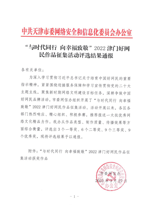 據(jù)悉,市委網(wǎng)信辦此次開展“與時代同行 向幸福致敬”2022津門好網(wǎng)民作品征集活動,從作品類型、制作質(zhì)量、傳播效果等方面綜合衡量,從各區(qū)各部門推薦報送的一大批優(yōu)秀網(wǎng)絡(luò)文化精品力作中,共評選出3個一等獎、6個二等獎、9個三等獎、9個優(yōu)秀獎