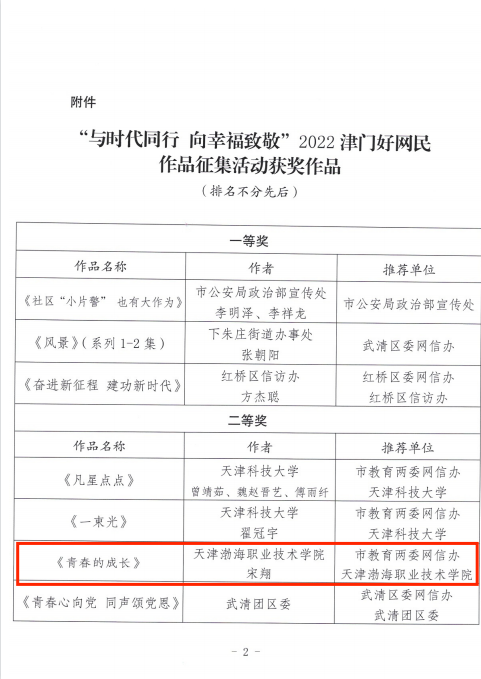 近日,中共天津市委網(wǎng)絡(luò)安全和信息化委員會辦公室公布了《“與時代同行 向幸福致敬”2022津門好網(wǎng)民作品征集活動評選結(jié)果通報》。市教育兩委網(wǎng)信辦和學(xué)院推薦的思政教學(xué)部教師宋翔作品《青春的成長》榮獲二等獎。