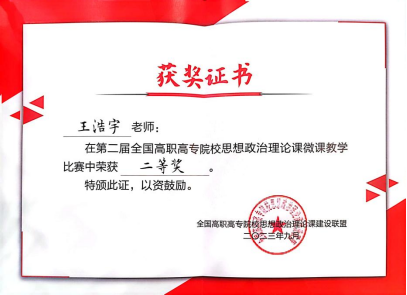 近日,第二屆全國高職高專院校思想政治理論課微課教學比賽圓滿落幕,學院思政教學部教師王浩宇榮獲大賽二等獎。