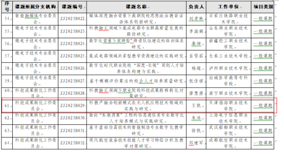 此項活動于2023年6月開展,學院組織多個課題團隊參加申報活動,推薦申報優秀課題共8項。經中國職業技術教育學會專家組的評審,最終學院推薦的《科教產融合創新模式在無人機應用技術領域的實踐與研究》、《產教融合視域下職業院校青年教師專業發展路徑研究》兩項課題獲批立項。
