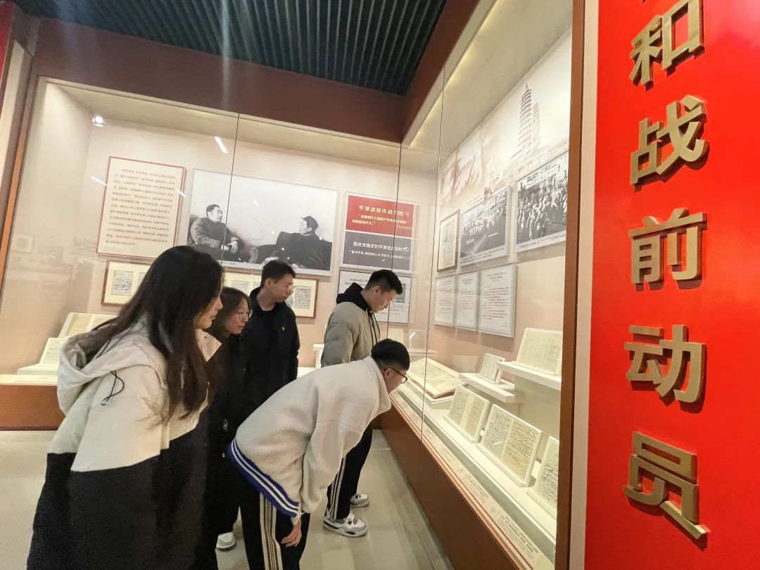 進入展廳,偉人雕像巍然屹立,同學們仔細觀看展覽,不時在展柜邊駐足,深刻感悟革命先烈的英雄事跡,從中汲取精神偉力。展館內,一幅幅珍貴的老照片、一件件斑駁的老物件、一份份寶貴的歷史文獻,全面、真實地還原著平津戰役的各種歷史細節。