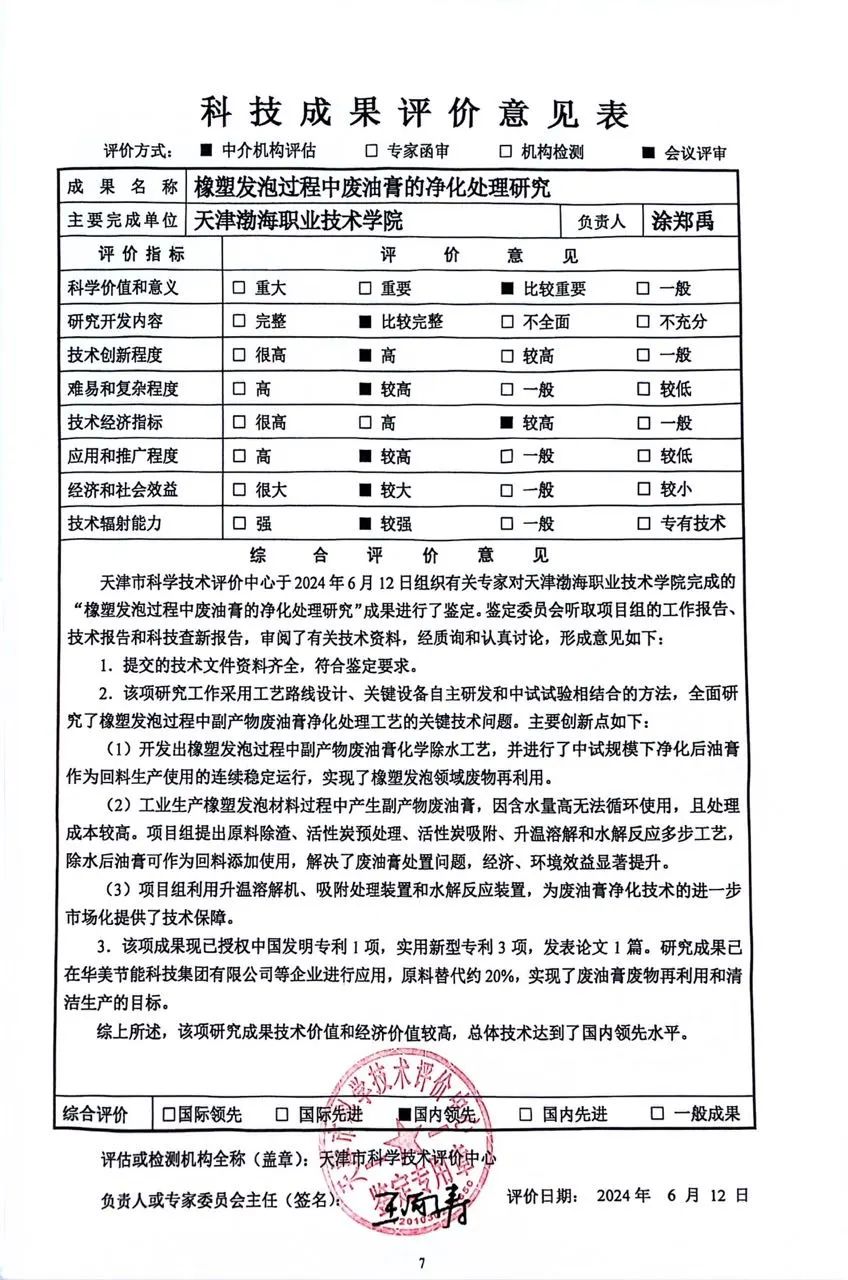 近日,天津市科學技術評價中心的專家組對天津渤海職業技術學院綠色石化科技服務團隊的“橡塑發泡過程中廢油膏的凈化處理研究”科研成果進行鑒定,最終認定該成果達到國內領先水平。
