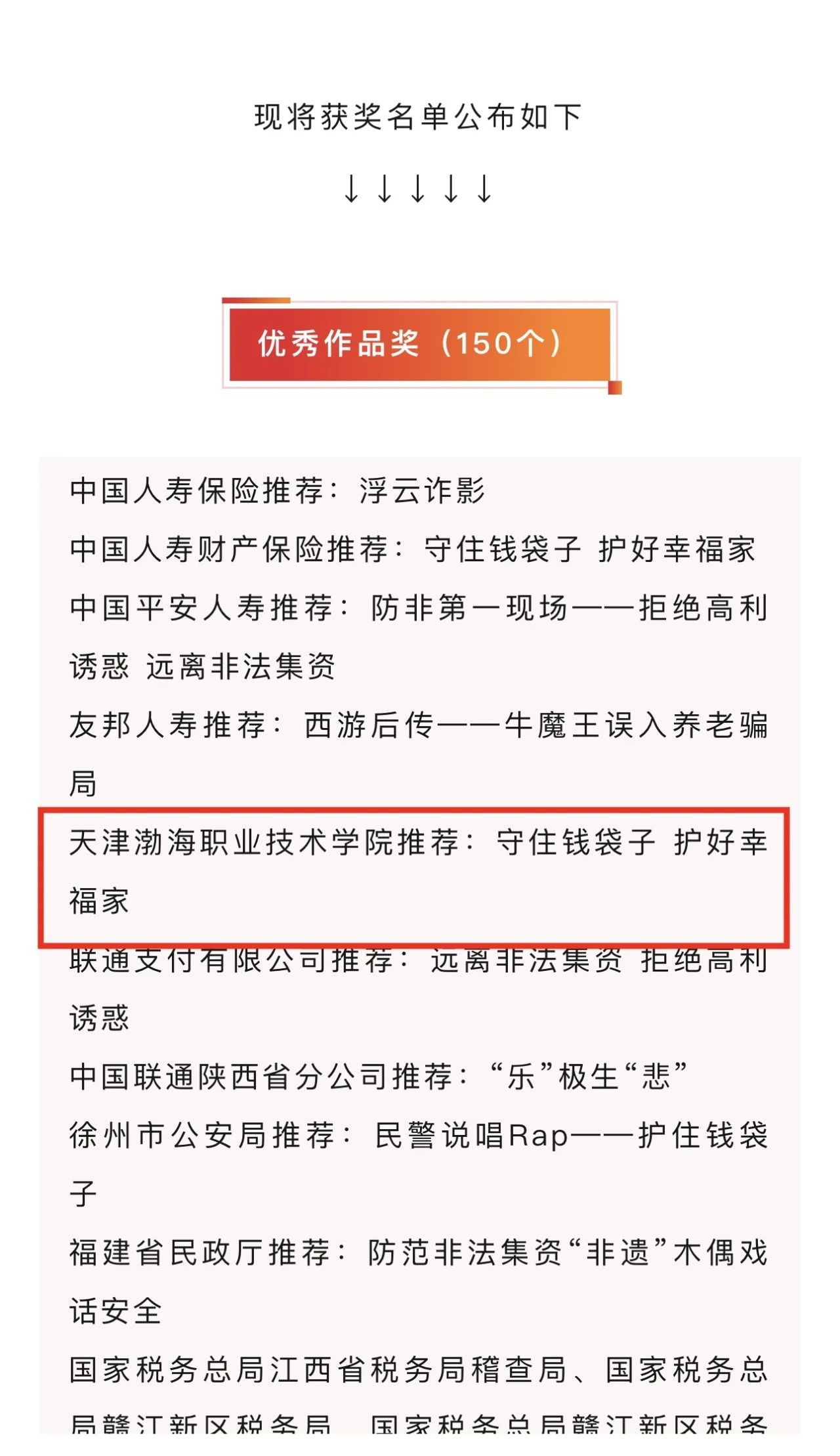 本次獲獎既提升了學院社會影響力,也彰顯了職業教育在服務社會與提升公民素質上的積極貢獻,天津渤海職業技術學院將持續深化金融知識宣傳教育,吸引更多師生參與推動金融安全教育常態化與系統化,在思政育人道路上再創佳績!