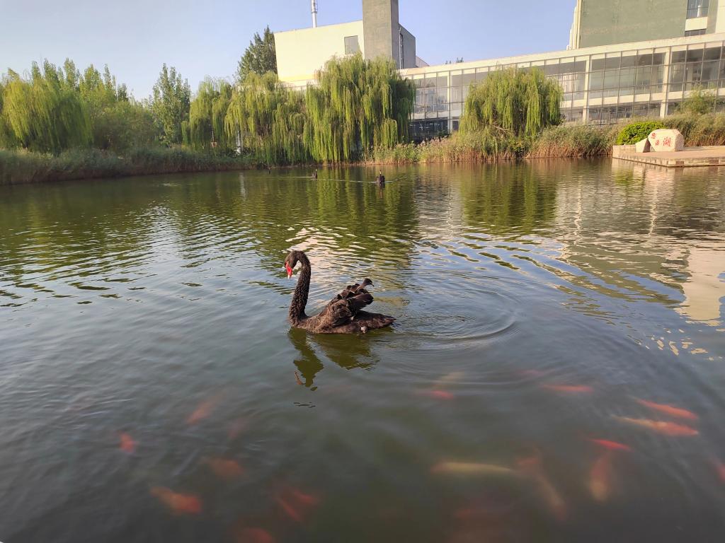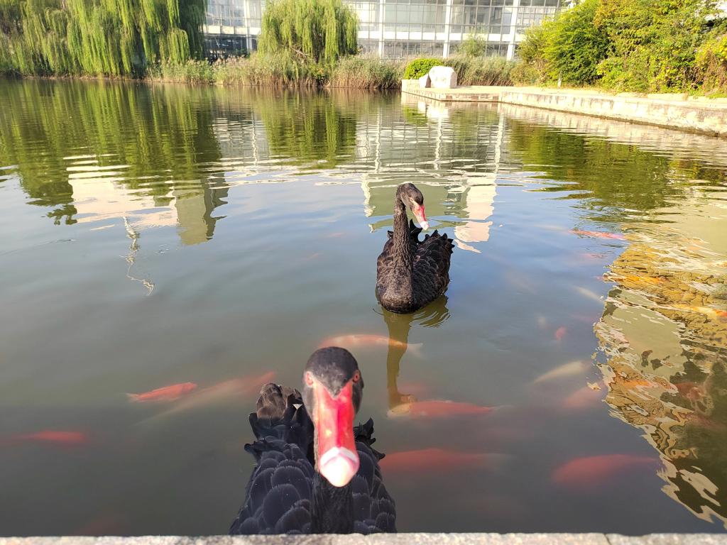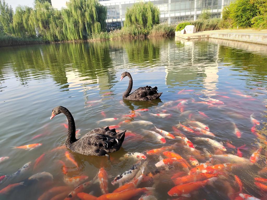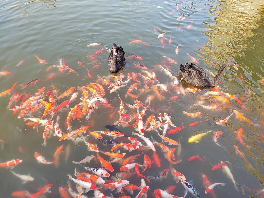 魚兒歡快地在黑天鵝身邊穿梭,黑天鵝則輕輕擺動翅膀,仿佛在和魚兒共同起舞。