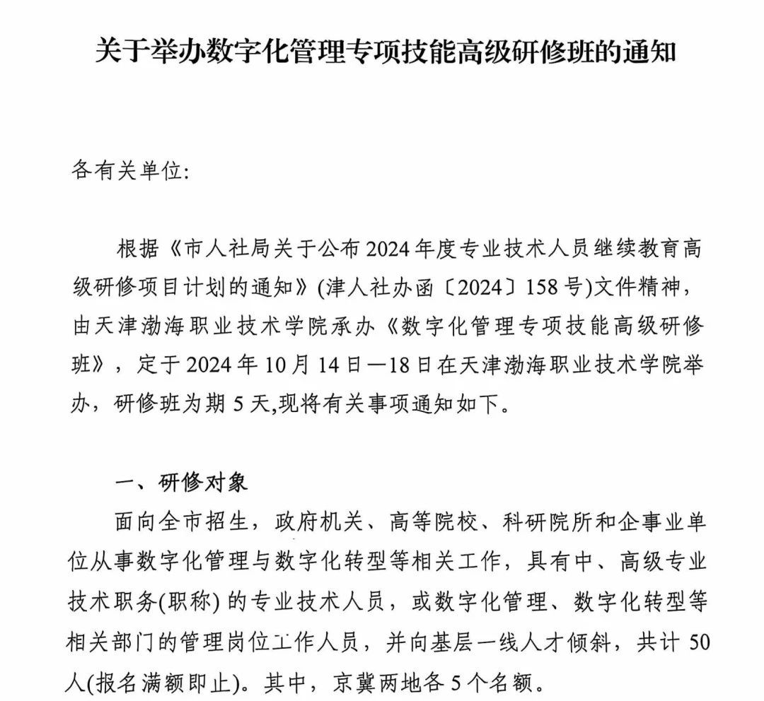 關于舉辦數字化管理專項技能高級研修班的通知
