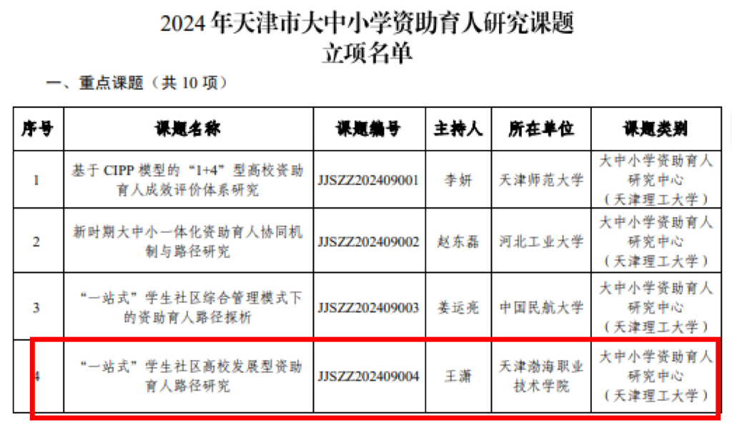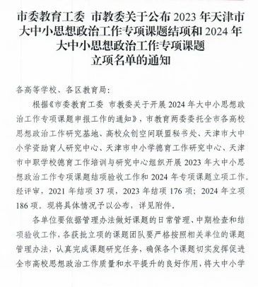 近日,市教育兩委公布了2024年大中小思想政治工作專項課題立項結果,學院王瀟課題組《“一站式”學生社區高校發展型資助育人路徑研究》獲批資助育人研究課題重點課題。