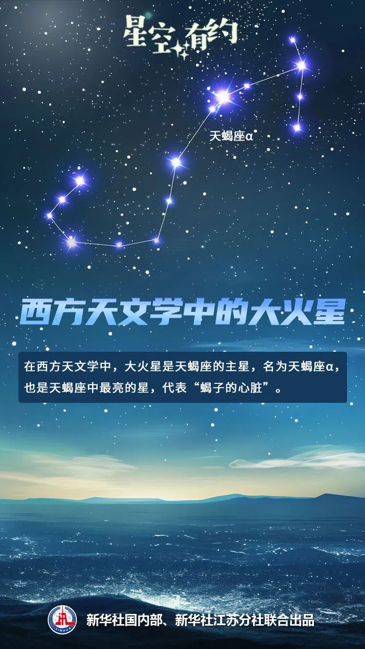 在西方天文學中,大火星是天蝎座的主星,名為天蝎座α,也是天蝎座中最亮的星,代表“蝎子的心臟”。作為一顆紅超巨星,它的半徑約為太陽半徑的幾百倍。它與一個藍色主序星組成了一個雙星系統。在它的周圍還有一個反射星云,通常反射星云多呈藍色,但由于大火星的強烈紅光,這一星云呈現少有的紅色。