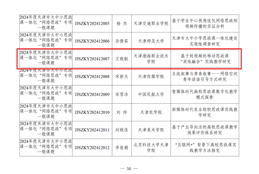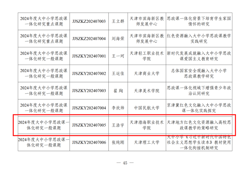 近日,市教育兩委公布了2024年天津市思想政治理論課常設(shè)課題立項(xiàng)名單。學(xué)院思政教學(xué)部教師王曉航申報(bào)的《基于短視頻的移動(dòng)思政課“雙線融合”實(shí)踐教學(xué)研究》獲批大中小學(xué)思政課一體化“網(wǎng)絡(luò)思政”專項(xiàng)課題立項(xiàng),王浩宇申報(bào)的《天津地方紅色文化資源融入高校思政課教學(xué)的策略研究》獲批大中小學(xué)思政課一體化研究課題立項(xiàng)。