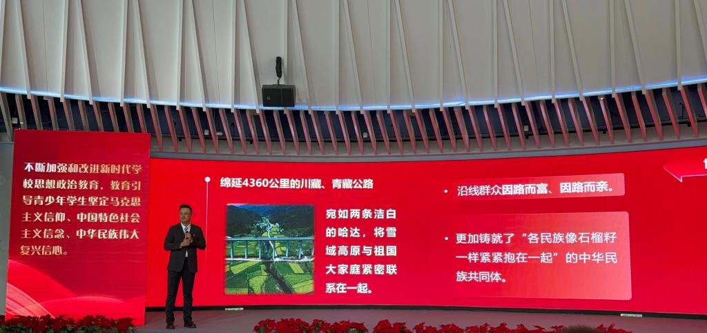 在現(xiàn)場(chǎng)展示環(huán)節(jié),趙良斌、張蕊、王曉航、佟超、侯合金團(tuán)隊(duì)的課程作品《賡續(xù)兩路精神 致敬青春征程》扣人心弦,讓現(xiàn)場(chǎng)評(píng)委及觀眾產(chǎn)生共鳴。該作品以 “兩路”精神為選題,趙良斌憑借徒步行走的親身經(jīng)歷,彷佛帶領(lǐng)大家穿越歷史時(shí)空。在他的講述中,眾人一同致敬那些開(kāi)山劈石、修路架橋、奮勇拼搏的筑路戰(zhàn)士,領(lǐng)略川藏、青藏公路上動(dòng)人心魄的傳奇和精彩瞬間,將“兩路”精神豐碑,生動(dòng)地再現(xiàn)至每位師生的心間。