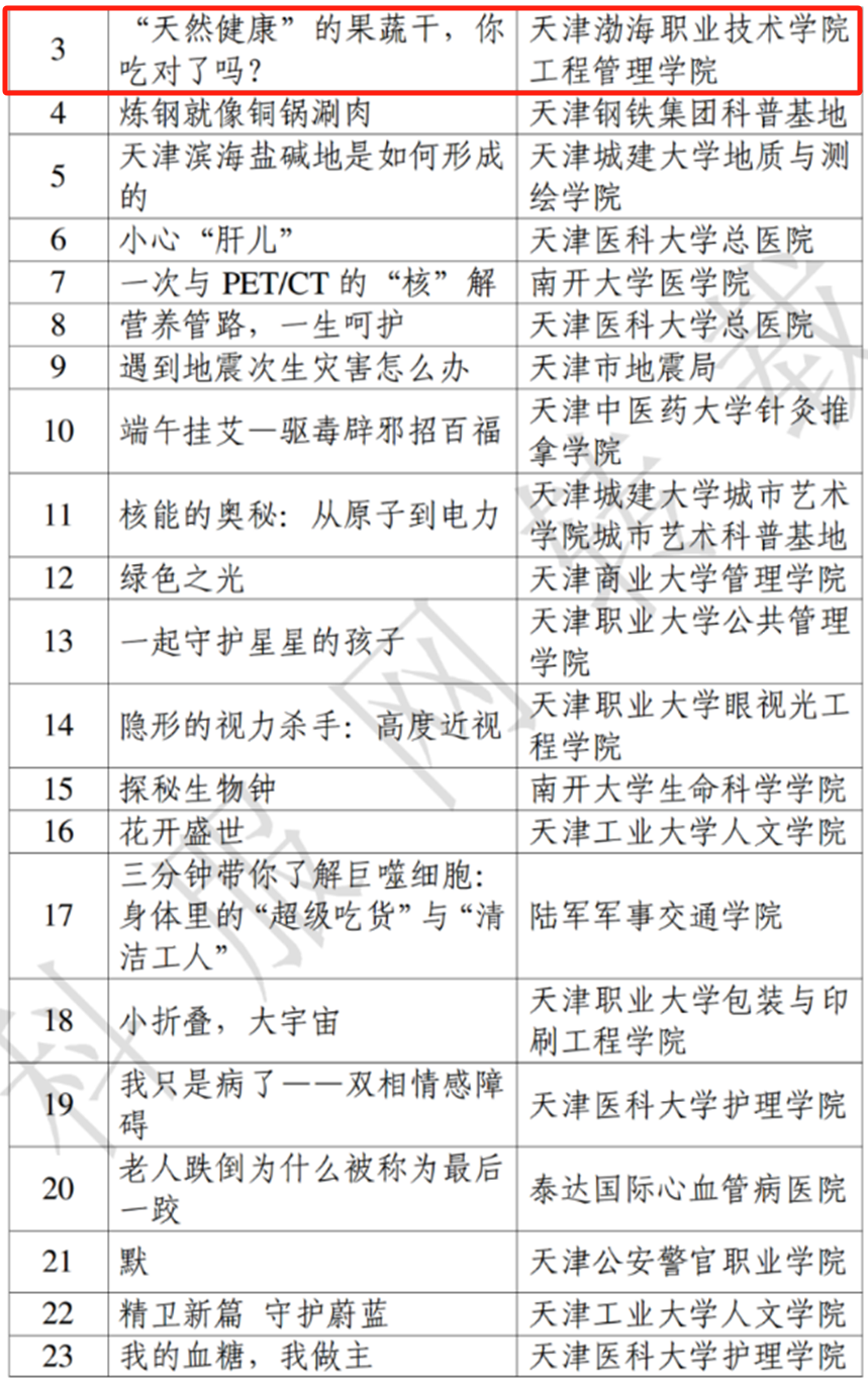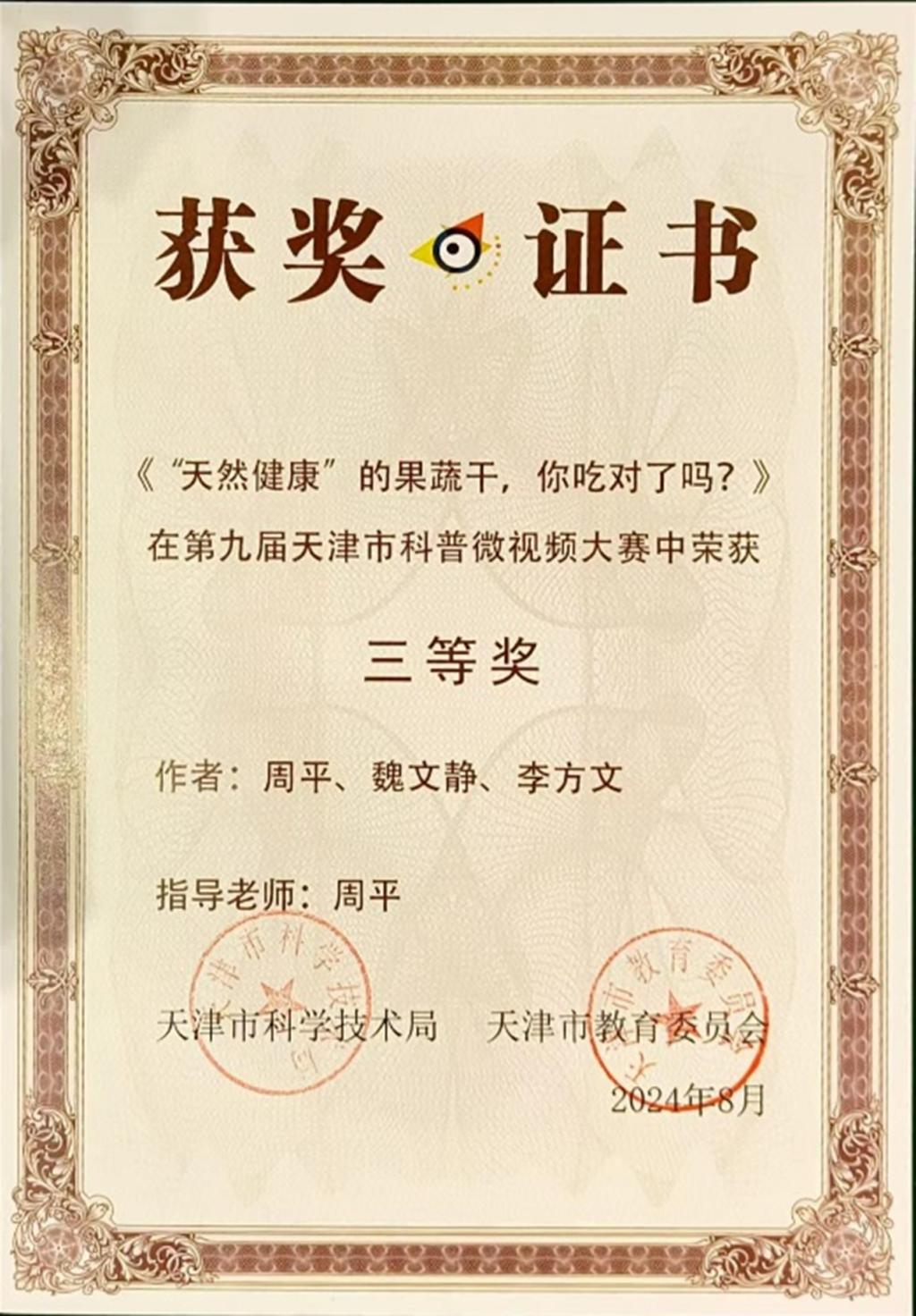 為推動學院科普工作,提高師生科教強國意識,按照市科技局、市教委發布的《市科技局市教委關于舉辦第九屆天津市科普微視頻大賽的通知》的要求,學院組織全院教師積極參加了本次大賽活動,經教師踴躍投稿,共推薦11項作品上報參賽。學院推薦參賽作品《“天然健康”的果蔬干,你吃對了嗎?》獲得三等獎。據悉,本次大賽共60個視頻作品獲獎,高職院校共有7個作品獲獎。
