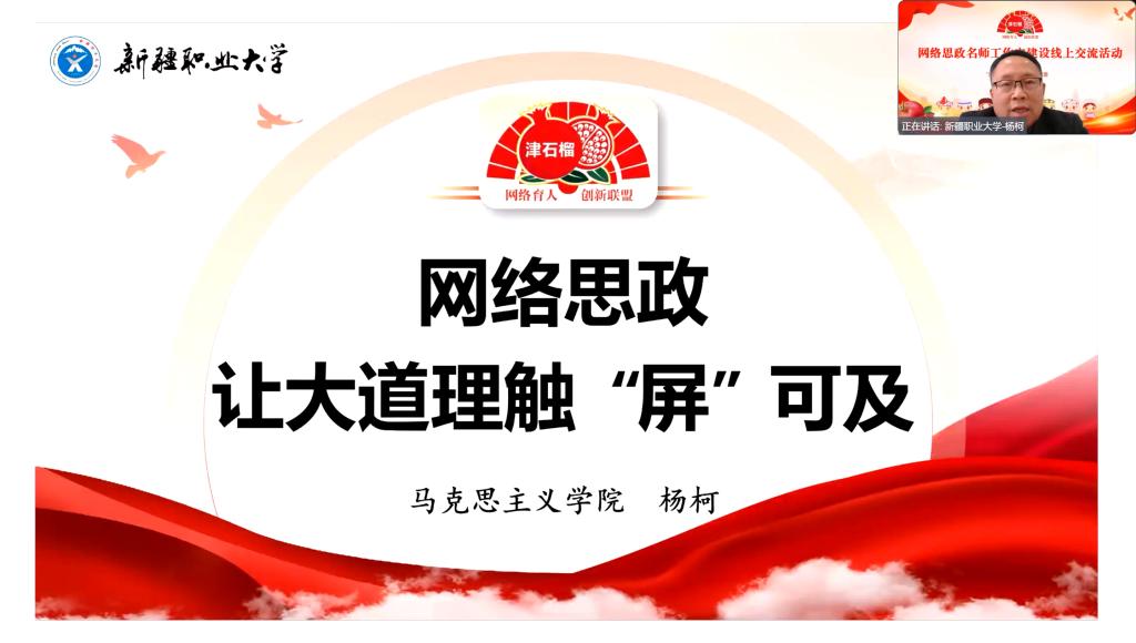 為進一步推動“津石榴”網絡育人創新聯盟建設,形成育人合力,提升教師網絡育人能力,鑄牢中華民族共同體意識,11月8日下午,學院開展了“津石榴”網絡育人創新聯盟網絡思政名師工作室建設線上培訓交流活動。黨委副書記、工會主席、副院長王蕾主持會議,和田職業技術學院、天津交通職業技術學院、烏魯木齊職業大學、新疆輕工職業技術學院、天津醫學高等專科學校、天津現代職業技術學院、喀什職業技術學院、新疆職業大學、天津市紅星職業中等專業學校、天津市化學工業學校、奇臺中等職業技術學院等聯盟單位相關領導、思政教師、網絡思政名師工作室成員等100余人線上參會,聯盟專家委員會專家、新疆職業大學馬克思主義學院院長楊柯教授線上出席會議,學院市級、校級網絡思政名師工作室主要成員參會。