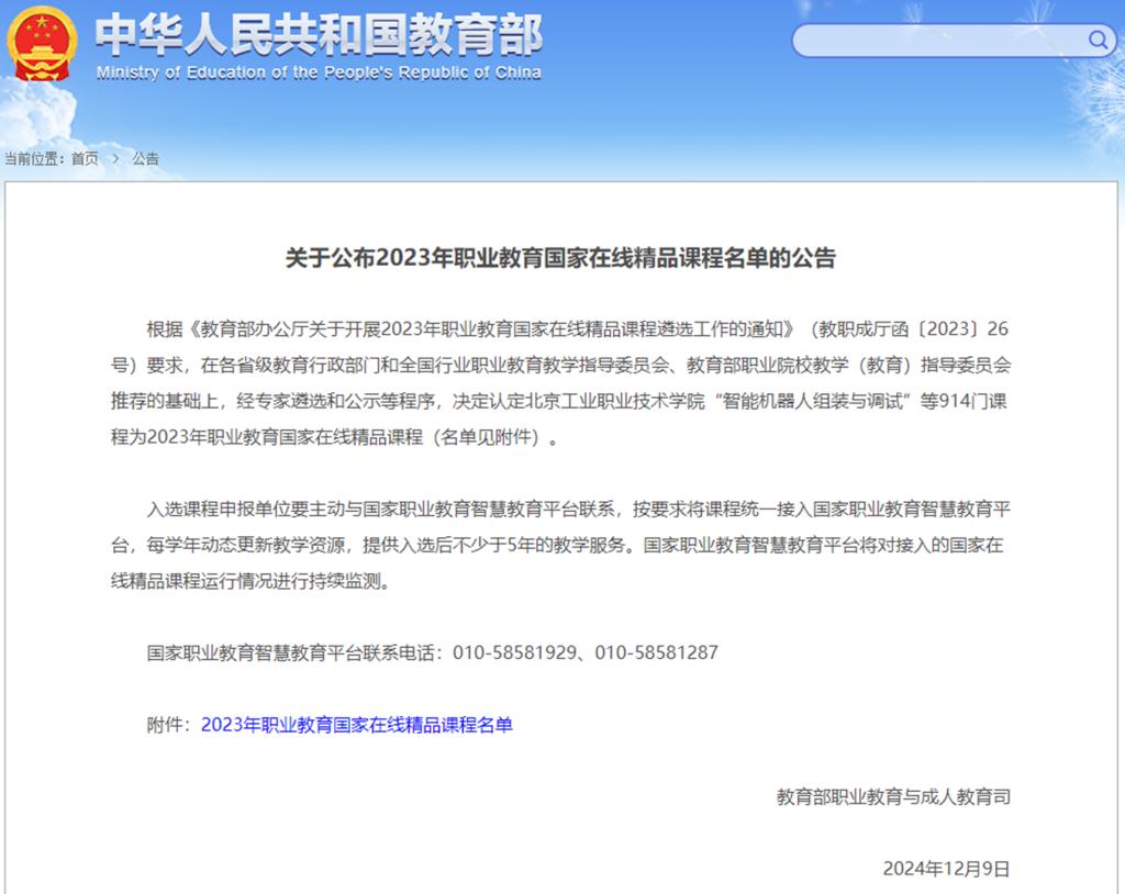 12月9日,教育部職業教育與成人教育司發布了《關于公布2023年職業教育國家在線精品課程名單的公告》,學院教授崔迎牽頭建設的《安全與環?!氛n程被認定為2023年職業教育國家在線精品課程,實現了學院課程建設新突破。