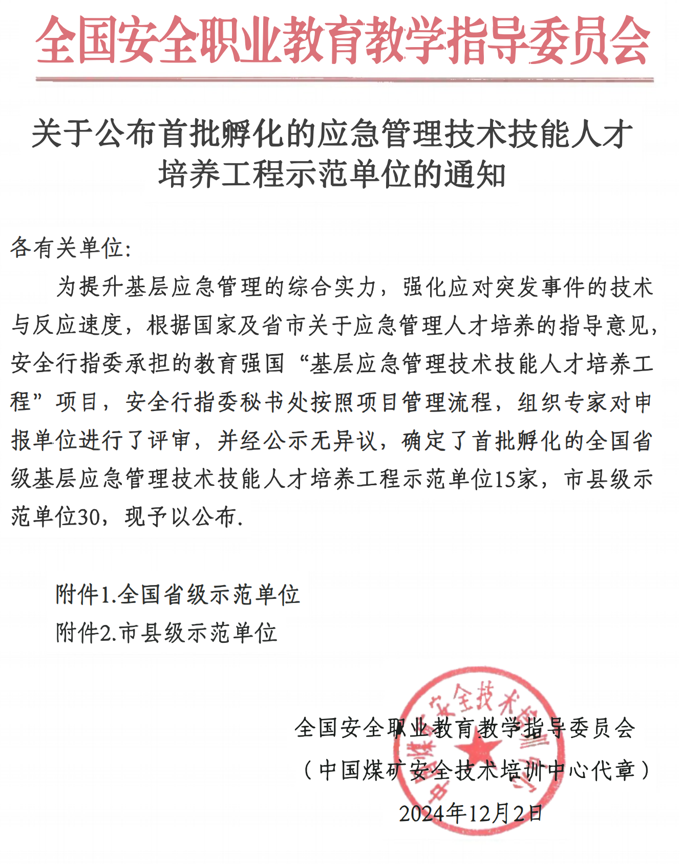 12月2日,全國安全職業教育教學指導委員會公布首批擬孵化的應急管理技術人才培養工程示范單位名單,確定了首批擬孵化的全國省級基層應急管理技術技能人才培養工程示范單位15家,市縣級示范單位30家。學院獲評首批擬孵化的“全國省級基層應急管理技術技能人才培養工程示范單位”。