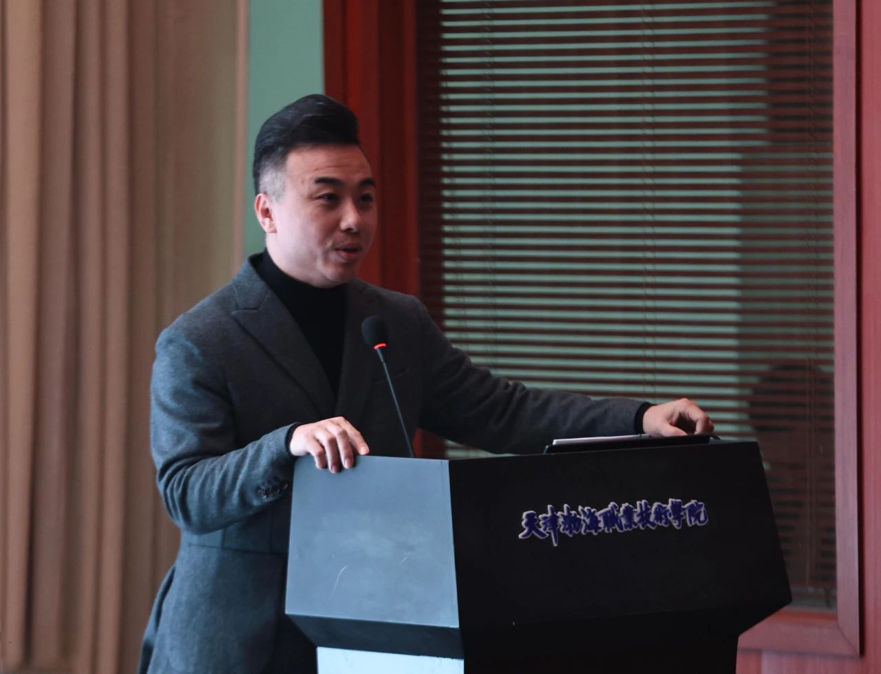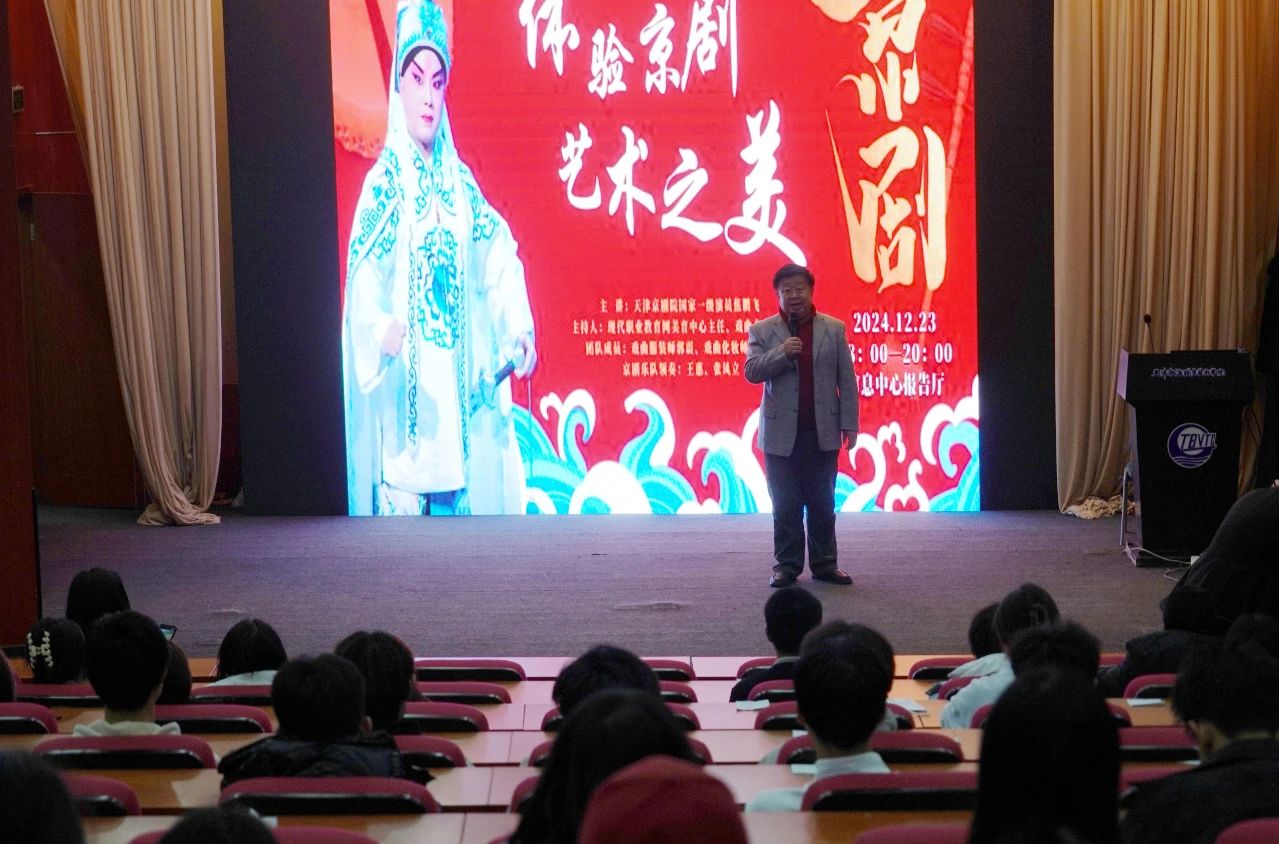 12月23日晚,天津渤海職業(yè)技術(shù)學(xué)院信息中心報(bào)告廳燈火通明,座無虛席,一場別開生面的“發(fā)現(xiàn)京劇之美”京劇名家進(jìn)校園活動在這里激情上演。天津京劇院國家一級演員焦鵬飛領(lǐng)銜,由戲曲服裝師、化妝師和樂隊(duì)共同組成的專業(yè)團(tuán)隊(duì),現(xiàn)代職業(yè)教育網(wǎng)總編劉俊仁、藝術(shù)總監(jiān)王建澤,天津渤海職業(yè)技術(shù)學(xué)院基礎(chǔ)部骨干教師及來自各二級學(xué)院、京劇班學(xué)生代表以及相關(guān)社團(tuán)同學(xué)共150多人參加活動。活動由現(xiàn)代職業(yè)教育網(wǎng)美育中心主任、戲曲專家張浩主持。