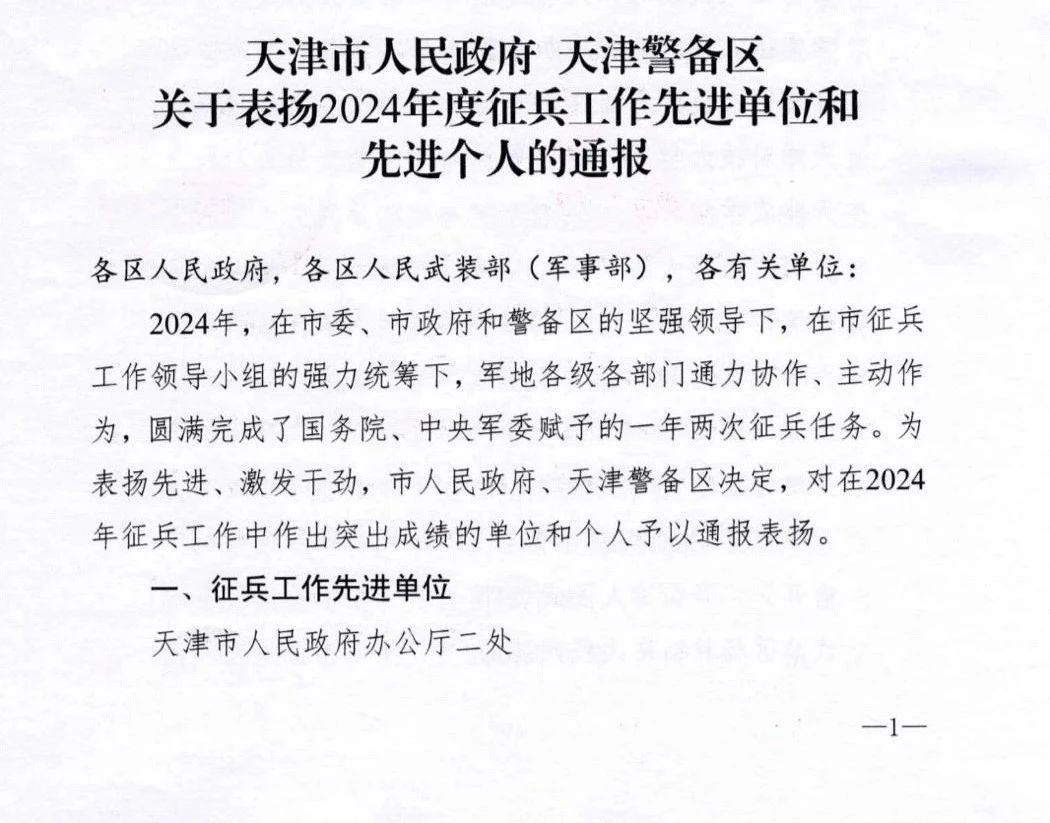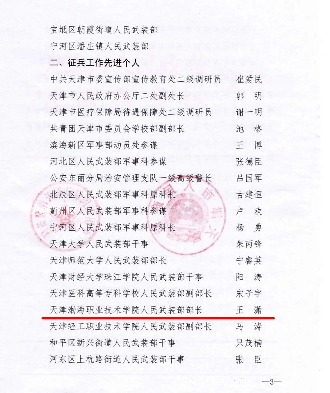 12月27日,2025年天津市征兵工作會議隆重舉行,天津市人民政府、天津警備區通報表揚2024年度征兵工作先進單位和先進個人,學校武裝部主任王瀟獲評天津市2024年度“征兵工作先進個人”榮譽稱號。