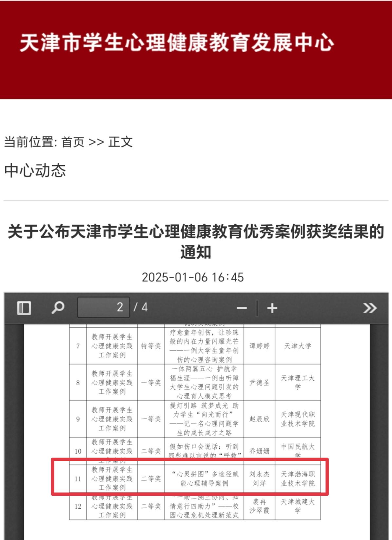 在天津市學生心理健康教育案例評選活動中,學校心理中心憑借卓越的專業素養、深入的教育洞察以及對學生細致入微的關懷,精心打造的心理健康教育案例 ——《"心靈拼圖"多途徑賦能心理輔導案例》,榮獲市級二等獎。