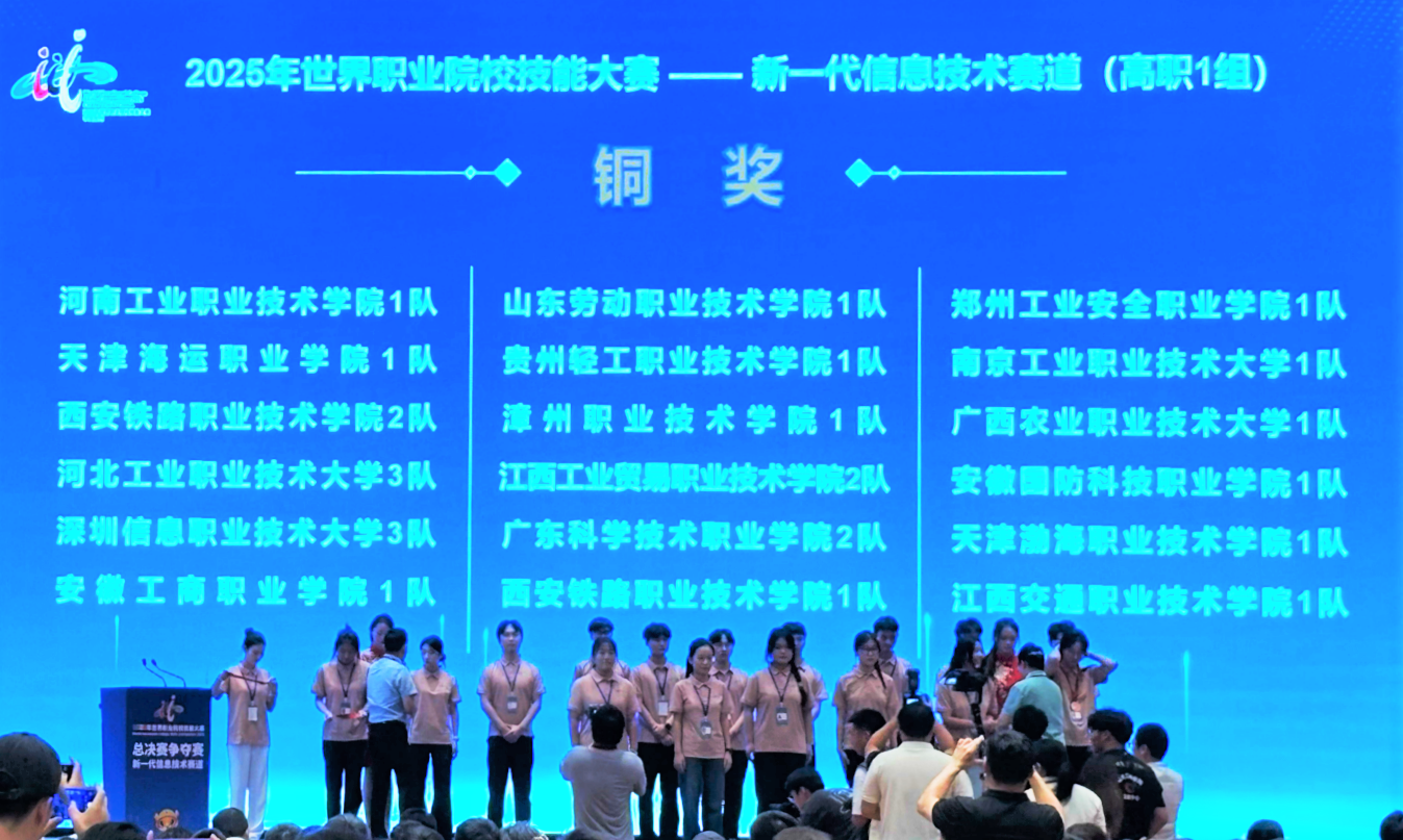 近日,2025年世界職業院校技能大賽爭奪賽新一代信息技術賽道(高職組)在江蘇常州落幕。我院人工智能學院團隊從全國208支頂尖高職隊伍中突圍,斬獲銅獎,彰顯學院在該領域的人才培養實力。