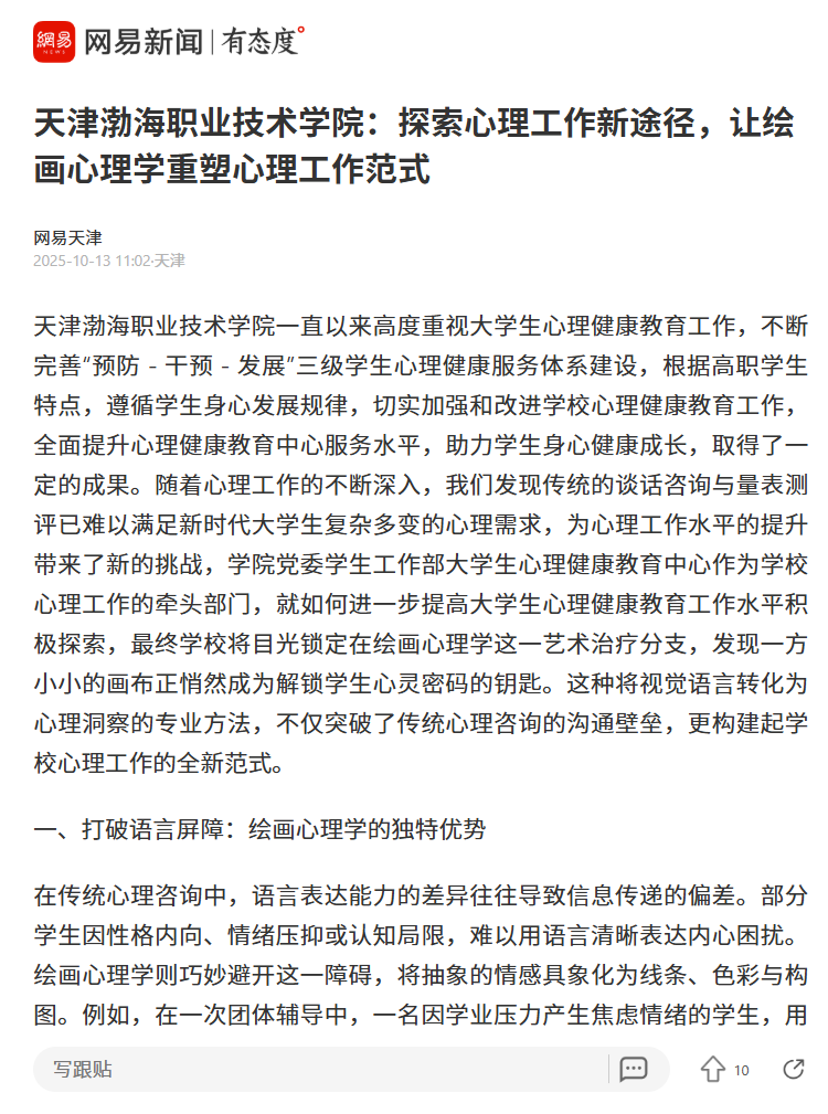 天津渤海職業(yè)技術(shù)學(xué)院一直以來高度重視大學(xué)生心理健康教育工作,不斷完善“預(yù)防 - 干預(yù) - 發(fā)展”三級學(xué)生心理健康服務(wù)體系建設(shè),根據(jù)高職學(xué)生特點,遵循學(xué)生身心發(fā)展規(guī)律,切實加強和改進學(xué)校心理健康教育工作,全面提升心理健康教育中心服務(wù)水平,助力學(xué)生身心健康成長,取得了一定的成果。隨著心理工作的不斷深入,我們發(fā)現(xiàn)傳統(tǒng)的談話咨詢與量表測評已難以滿足新時代大學(xué)生復(fù)雜多變的心理需求,為心理工作水平的提升帶來了新的挑戰(zhàn),學(xué)院黨委學(xué)生工作部大學(xué)生心理健康教育中心作為學(xué)校心理工作的牽頭部門,就如何進一步提高大學(xué)生心理健康教育工作水平積極探索,最終學(xué)校將目光鎖定在繪畫心理學(xué)這一藝術(shù)治療分支,發(fā)現(xiàn)一方小小的畫布正悄然成為解鎖學(xué)生心靈密碼的鑰匙。這種將視覺語言轉(zhuǎn)化為心理洞察的專業(yè)方法,不僅突破了傳統(tǒng)心理咨詢的溝通壁壘,更構(gòu)建起學(xué)校心理工作的全新范式。