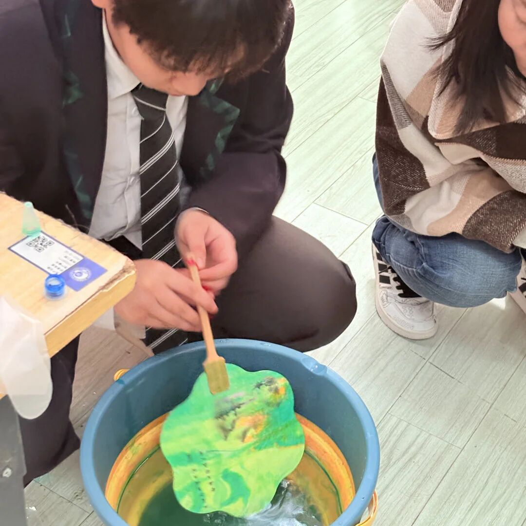 扎染體驗(yàn)活動(dòng)以“理論講解+實(shí)操示范”的模式展開,志愿者們首先通過圖文結(jié)合的方式,向?qū)W生們介紹了扎染的起源與發(fā)展,講解了捆扎技巧、染色原理等專業(yè)知識(shí),讓學(xué)生們深入了解扎染技藝的科學(xué)與藝術(shù)內(nèi)涵。在示范環(huán)節(jié),志愿者們現(xiàn)場(chǎng)展示了不同捆扎方式對(duì)應(yīng)的花紋效果,激發(fā)了學(xué)生們的創(chuàng)作熱情。實(shí)操過程中,學(xué)生們領(lǐng)取白色棉布、染料、橡皮筋等材料后,或獨(dú)自構(gòu)思,或小組討論,認(rèn)真完成布料捆扎、浸染、清水沖洗、晾曬等流程。隨著布料展開,原本素白的棉布上綻放出藍(lán)白相間、意趣天成的圖案,同學(xué)們?cè)隗@嘆之余,也對(duì)“三分染,七分扎”的古老智慧有了切身的體悟。