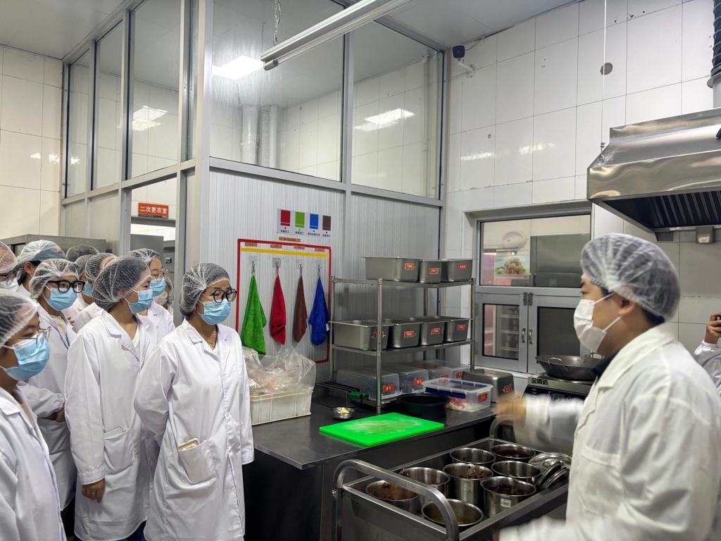 實踐環(huán)節(jié)后,學(xué)生們在后勤老師的帶領(lǐng)下,依次參觀了學(xué)校食堂的后廚、食品快速檢測室以及大宗物資采購庫房。在“二次更衣室”“粗加工間”等區(qū)域,學(xué)生們直觀了解了餐飲服務(wù)鏈中嚴(yán)格的衛(wèi)生分區(qū)與管理制度;在快檢室,專業(yè)人員演示了日常食材的快速篩查流程;在庫房,同學(xué)們學(xué)習(xí)了大宗物資的倉儲、溯源與品控管理要點。這一系列的參觀,使學(xué)生們對“從采購到餐桌”的完整食品安全管控體系有了系統(tǒng)而清晰的認(rèn)識。