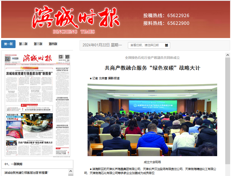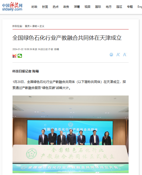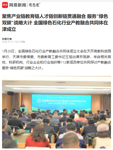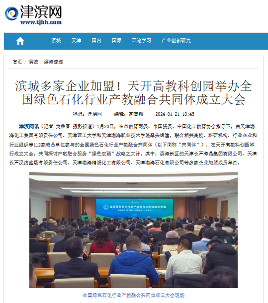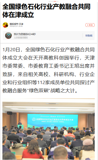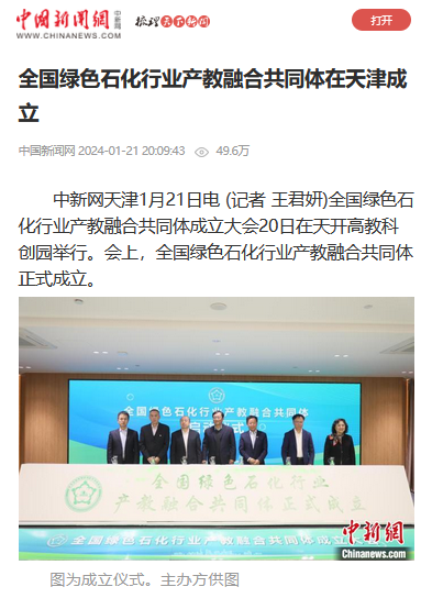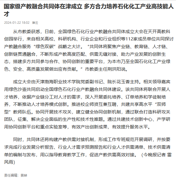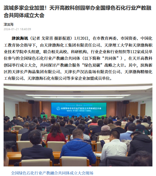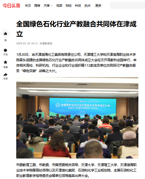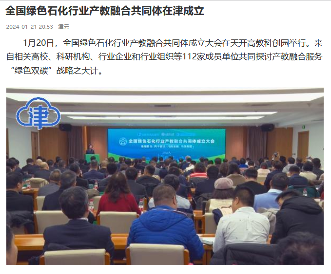 1月20日,由天津渤海化工集團有限責任公司、天津理工大學和天津渤海職業技術學院牽頭組建的全國綠色石化行業產教融合共同體成立大會在天開高教科創園舉行,來自相關高校、科研機構、行業企業和行業組織等112家成員單位共同探討產教融合服務“綠色雙碳”戰略之大計。本次活動得到媒體廣泛關注,新華社等多家媒體進行報道。