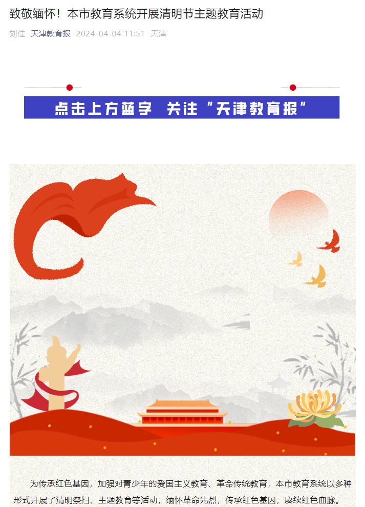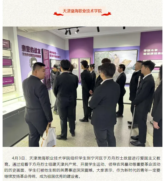 4月4日,《天津教育報》報道學院組織學生骨干前往天津市寧河區于方舟烈士故居開展了“清明祭英烈 厚植愛國情”緬懷于方舟烈士主題教育活動。