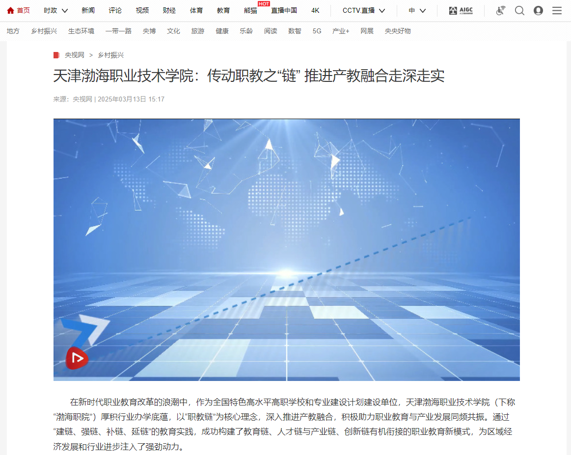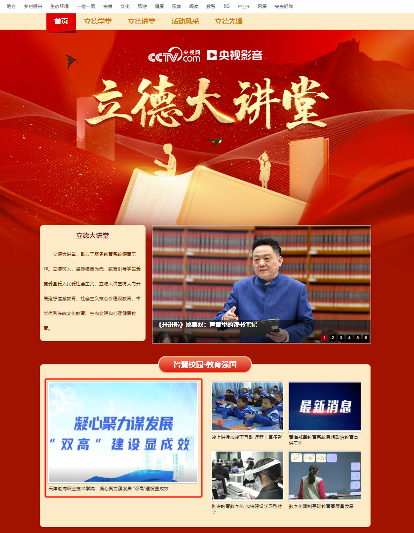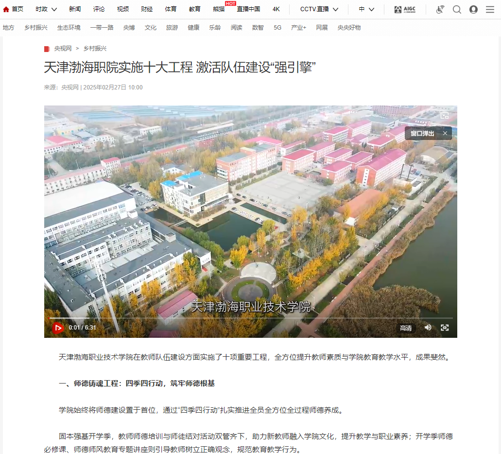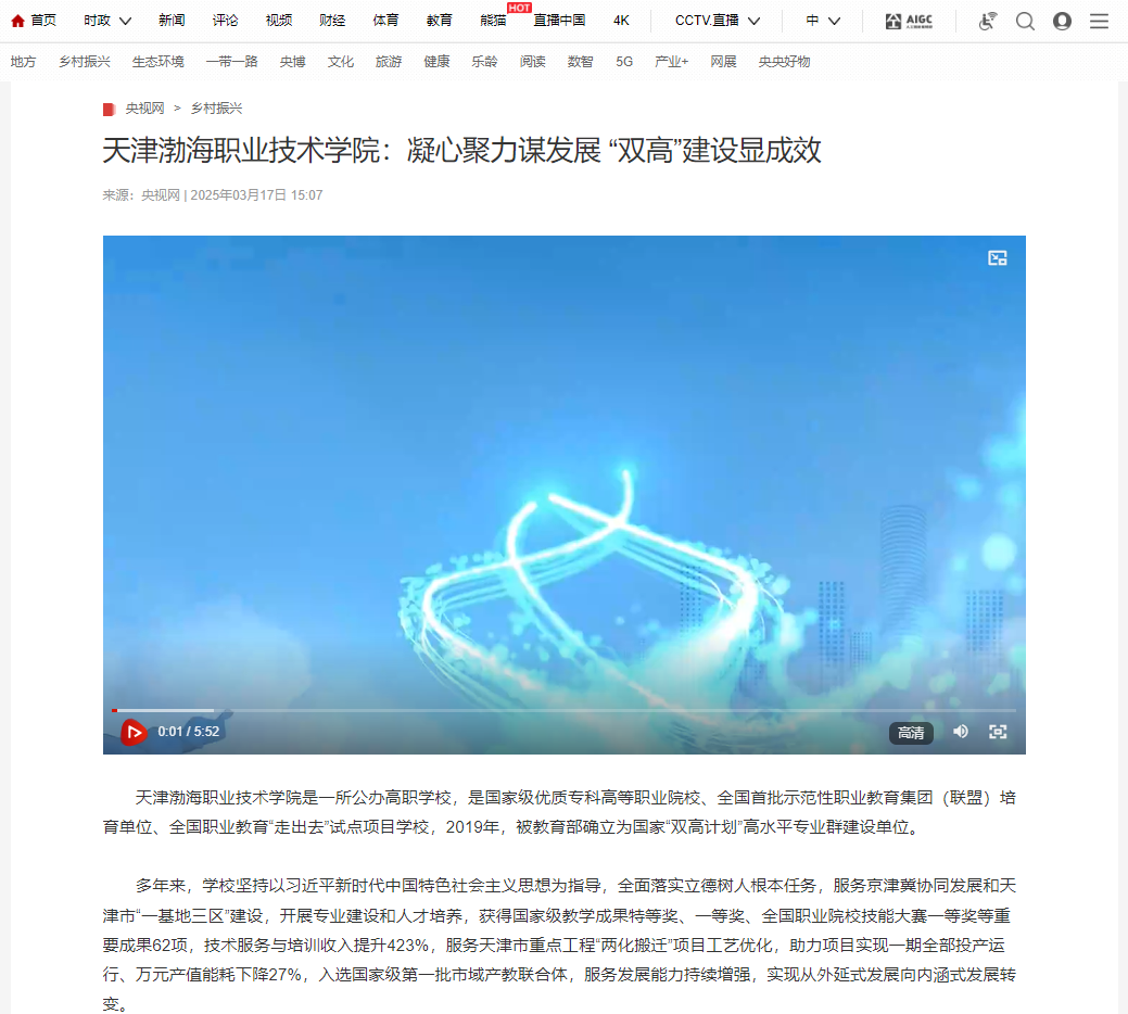 近日,央視網立德大講堂欄目分別以《凝心聚力謀發展 “雙高”建設顯成效》《天津渤海職業技術學院:傳動職教之“鏈” 推進產教融合走深走實》《實施十大工程 激活隊伍建設“強引擎”》為題,相繼報道學院在“雙高計劃”建設、產教融合以及師資隊伍建設方面的成果!