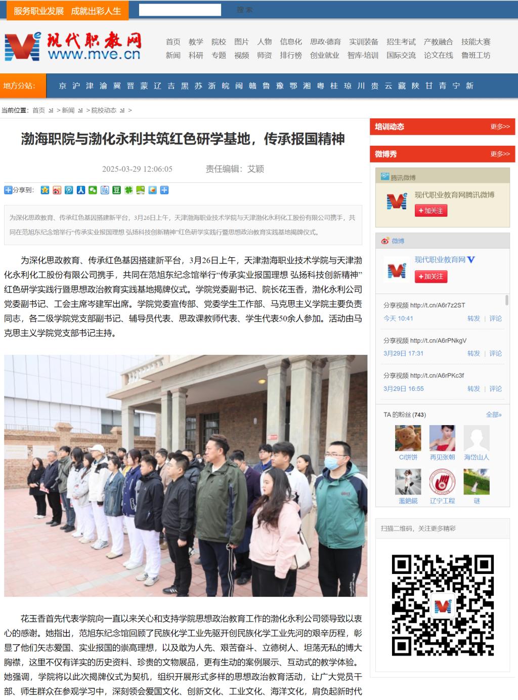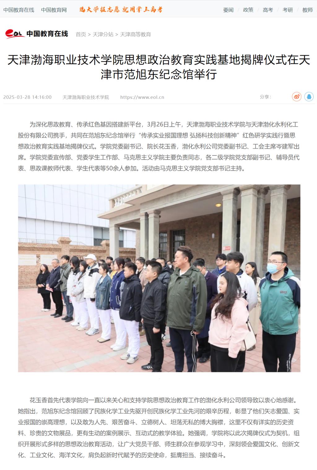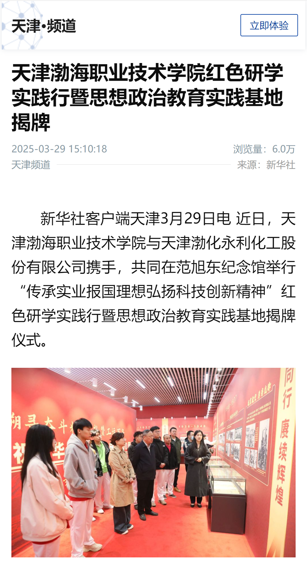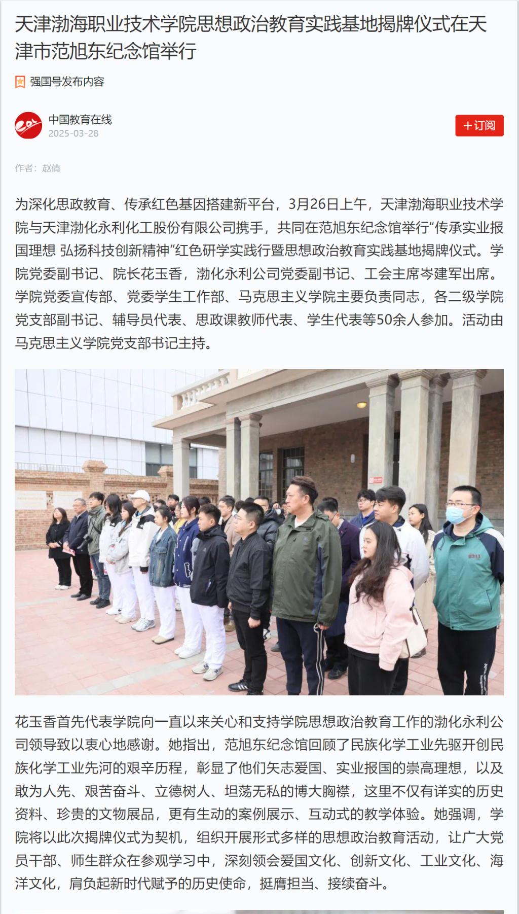 近日,學院與天津渤化永利化工股份有限公司在范旭東紀念館舉行的"傳承實業報國理想 弘揚科技創新精神"紅色研學實踐行暨思想政治教育實踐基地揭牌儀式,獲得新華社、學習強國、中國教育在線、現代職教網等權威媒體的聚焦報道。