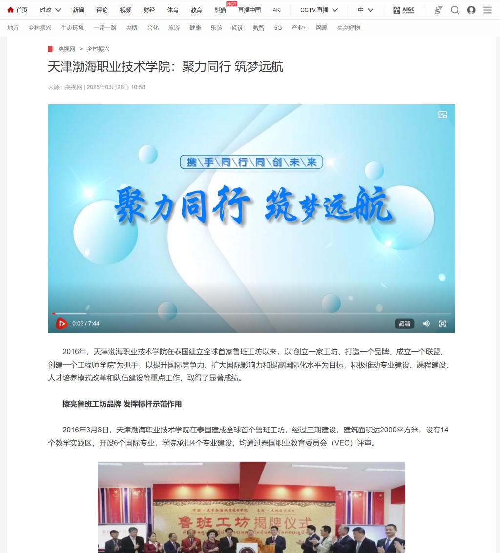 近日,央視網立德大講堂欄目以《天津渤海職業技術學院:聚力同行 筑夢遠航》為題,報道學院在魯班工坊建設方面的成果!