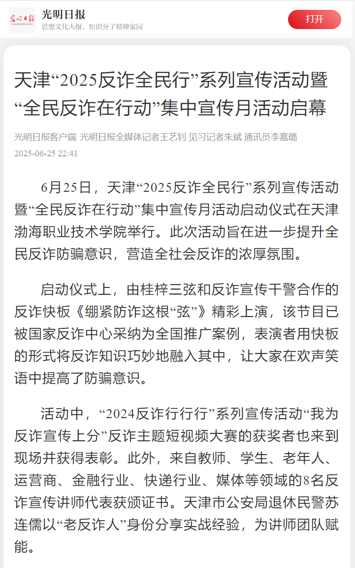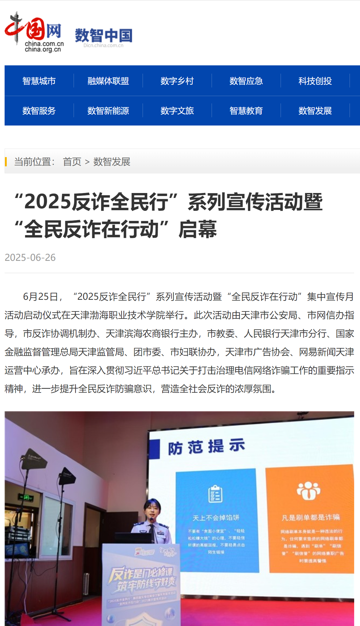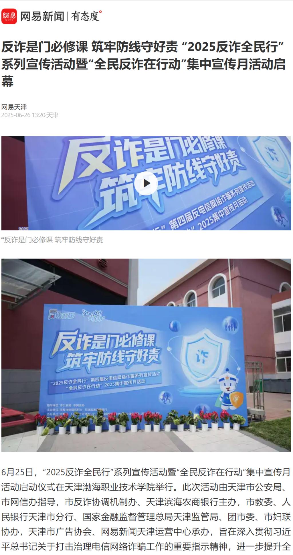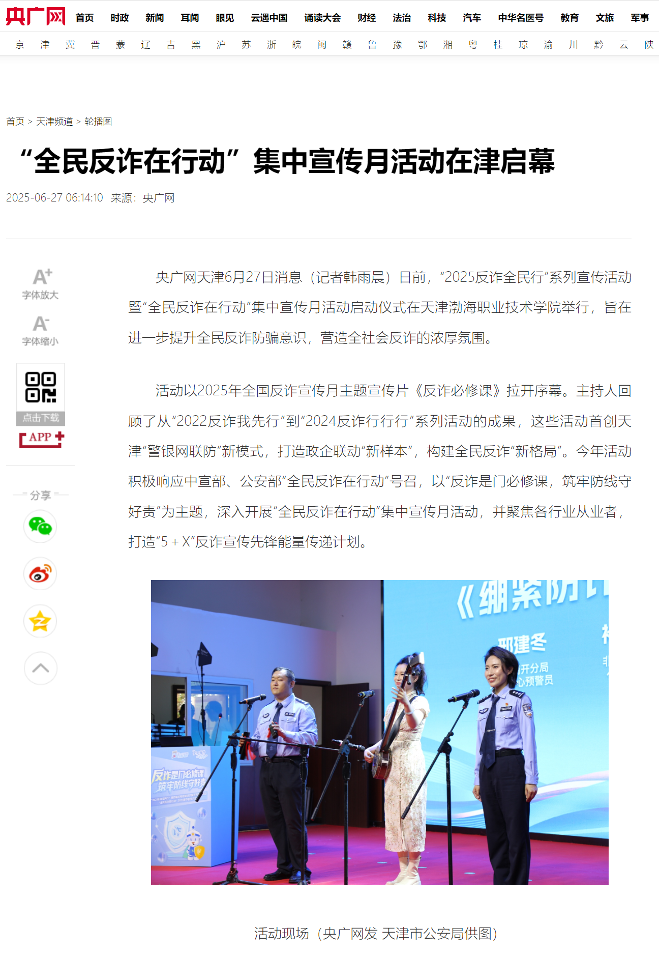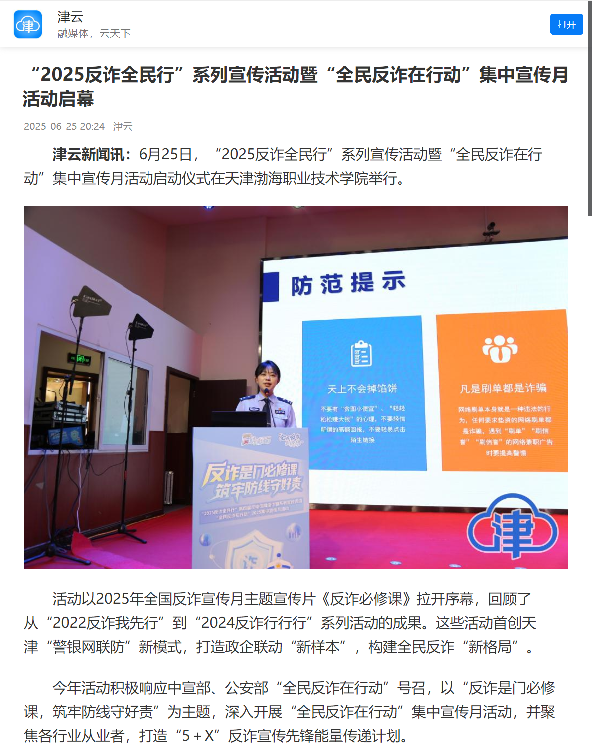 近日,天津“2025反詐全民行”系列宣傳活動暨“全民反詐在行動”集中宣傳月活動啟動儀式在天津渤海職業技術學院舉行,獲得光明日報、央廣網、中國網、法治日報社、網易新聞、騰訊新聞、搜狐新聞、天津日報、今晚報、津云等多家媒體報道。