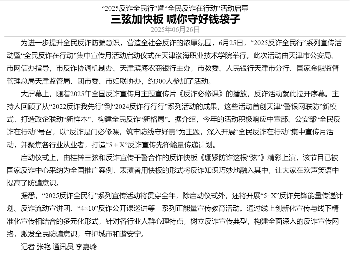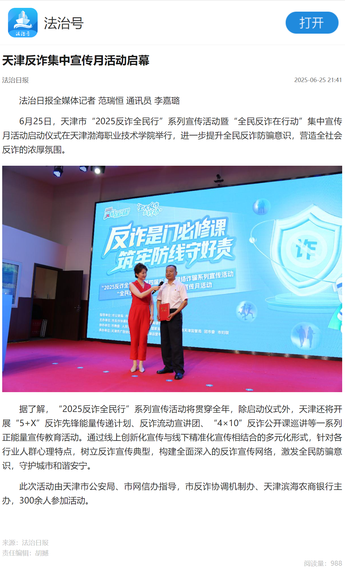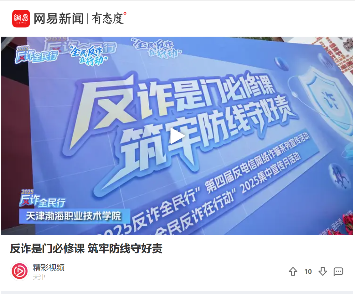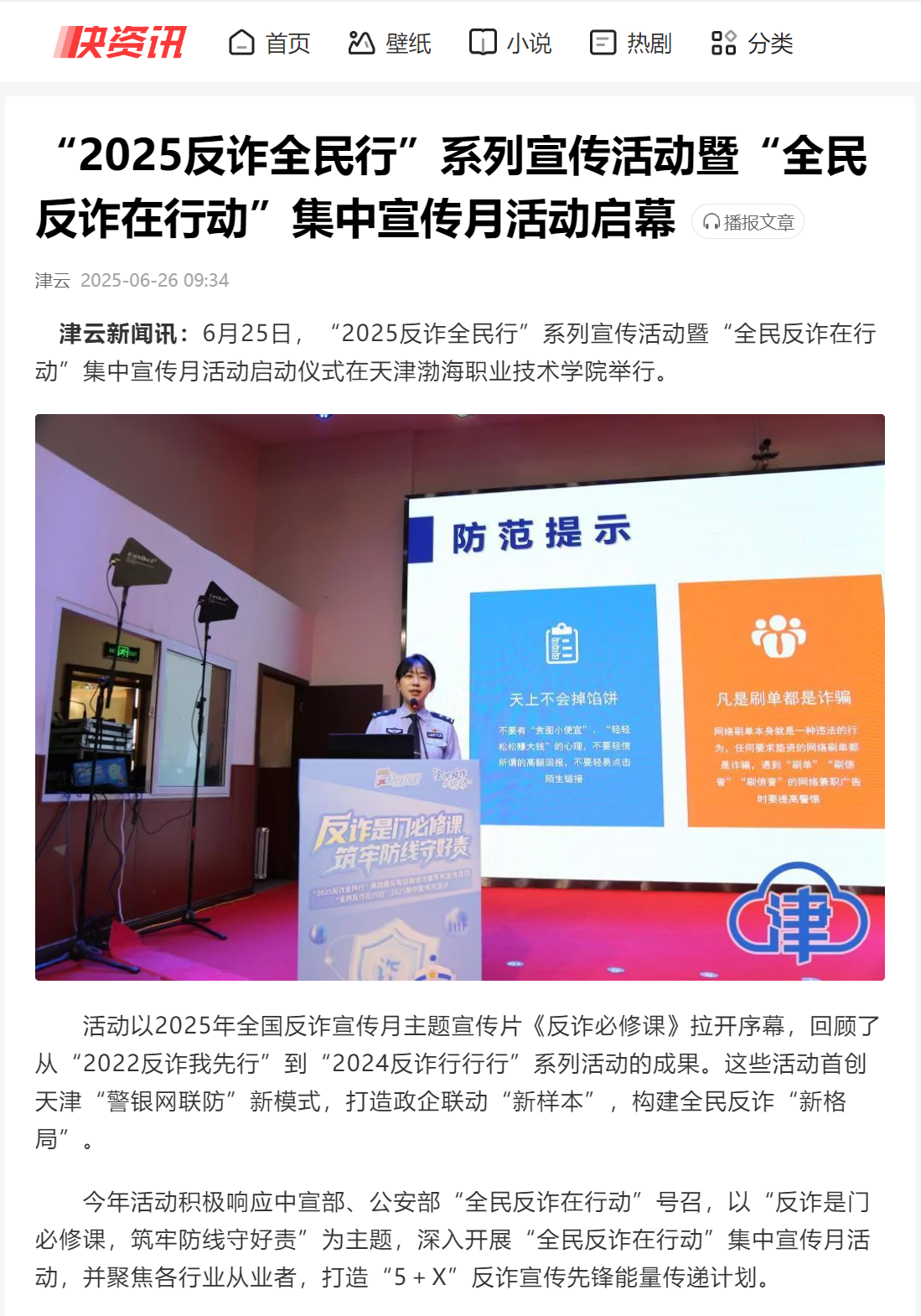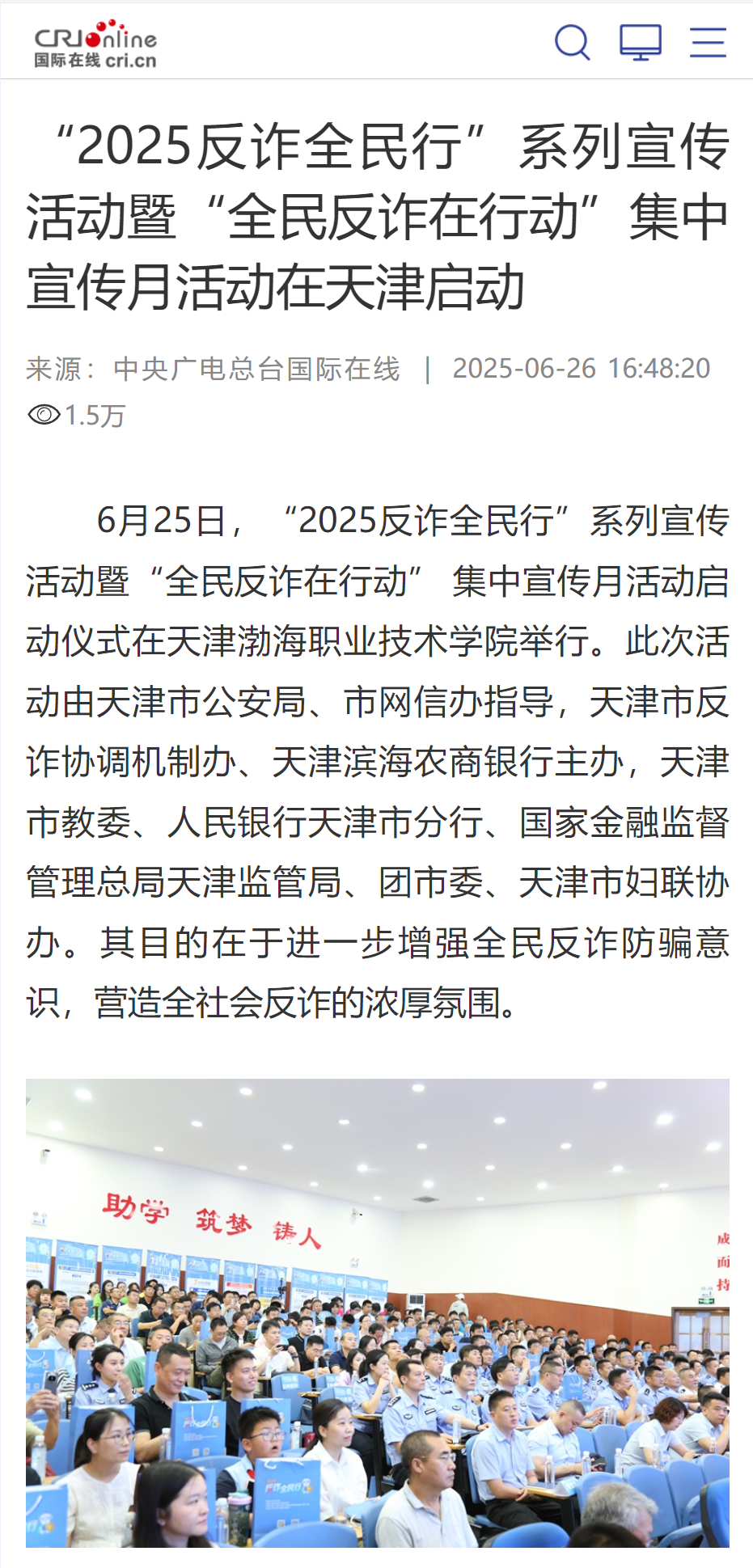 近日,天津“2025反詐全民行”系列宣傳活動暨“全民反詐在行動”集中宣傳月活動啟動儀式在天津渤海職業技術學院舉行,獲得光明日報、央廣網、中國網、法治日報社、網易新聞、騰訊新聞、搜狐新聞、天津日報、今晚報、津云等多家媒體報道。