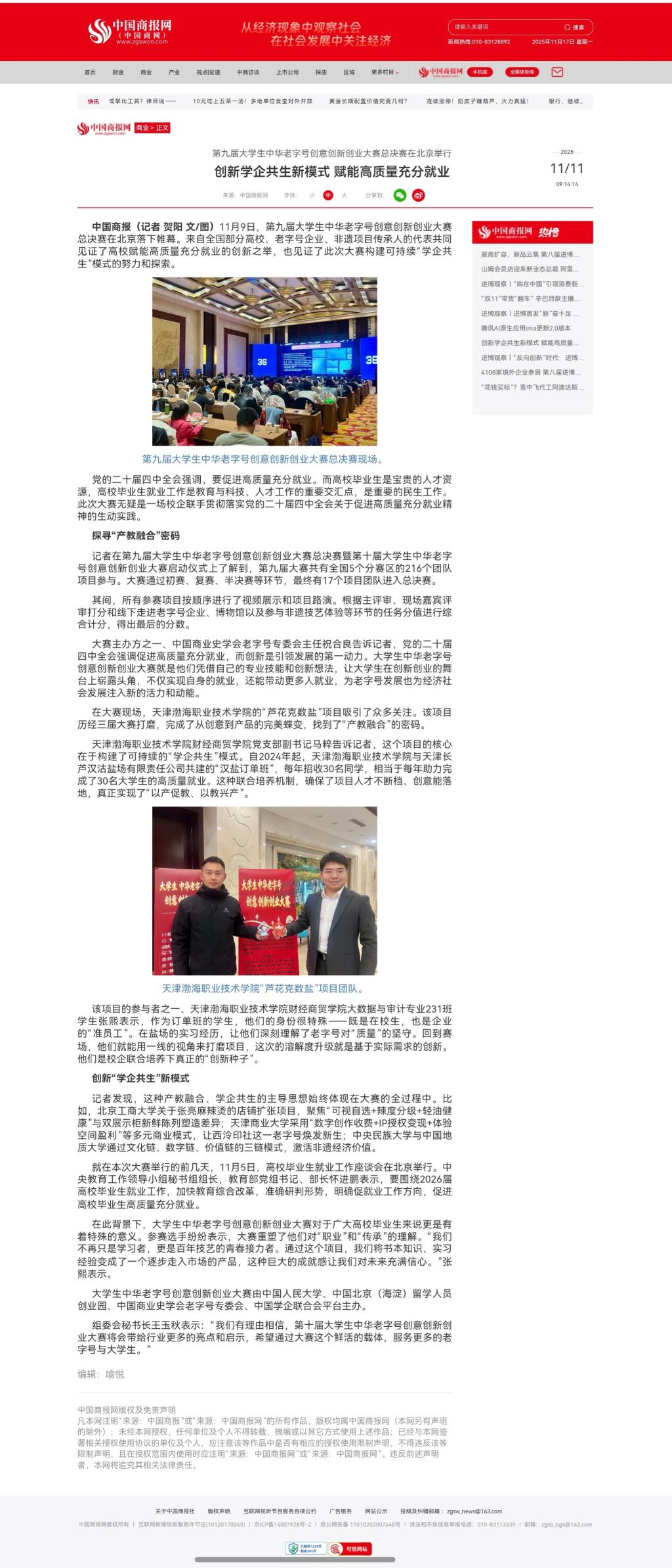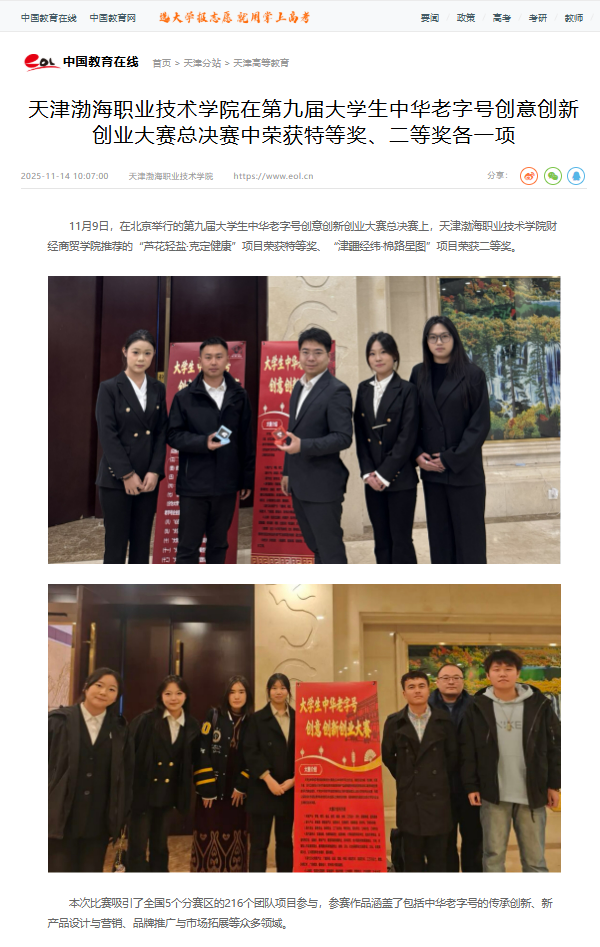 本月,在北京舉行的第九屆大學生中華老字號創意創新創業大賽總決賽上,學院財經商貿學院推薦的“蘆花輕鹽·克定健康”項目榮獲特等獎、“津疆經緯·棉路星圖”項目榮獲二等獎。近日,這一佳績相繼獲得學習強國、中國教育在線、中國商報網等媒體的聚焦報道。